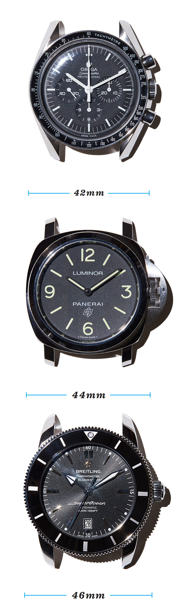 If you’re going to buy a watch, there are several aspects worth considering. Movement. Style. Case material. Dial design. But not least of all is watch size, and there’s a bevy of options out there that range from tiny to gargantuan. You could buy a sleek Nomos dress watch that’s 35mm in diameter, a 40mm Rolex GMT, a 44mm Panerai dive watch or, if you really wanted to go big or go home, a 50mm Breitling Avenger. On paper, the millimeters between them might seem minuscule, but on the wrist the differences are striking.