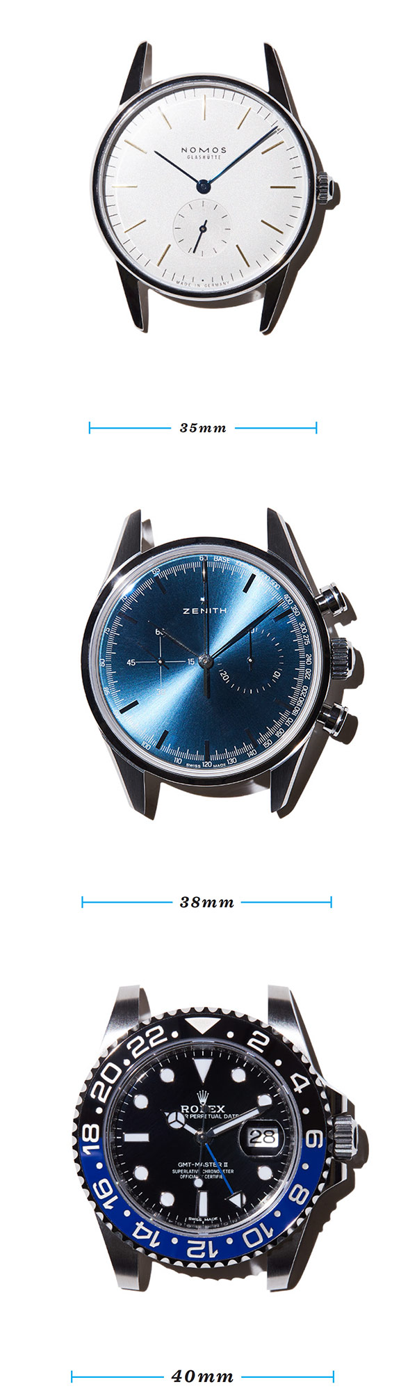 According to Lee, Rolex played a significant part, too. “Really, the popularity of models like the Submariner or GMT-Master II — those watches are around forty millimeters — caused a bit of a shift in the market, where men once wearing dress and professional watches switched to more sport watches,” he says. “So the case sizes just kind of inched up. That forty-to-forty-two-millimeter range is becoming the standard for a men’s watch.”