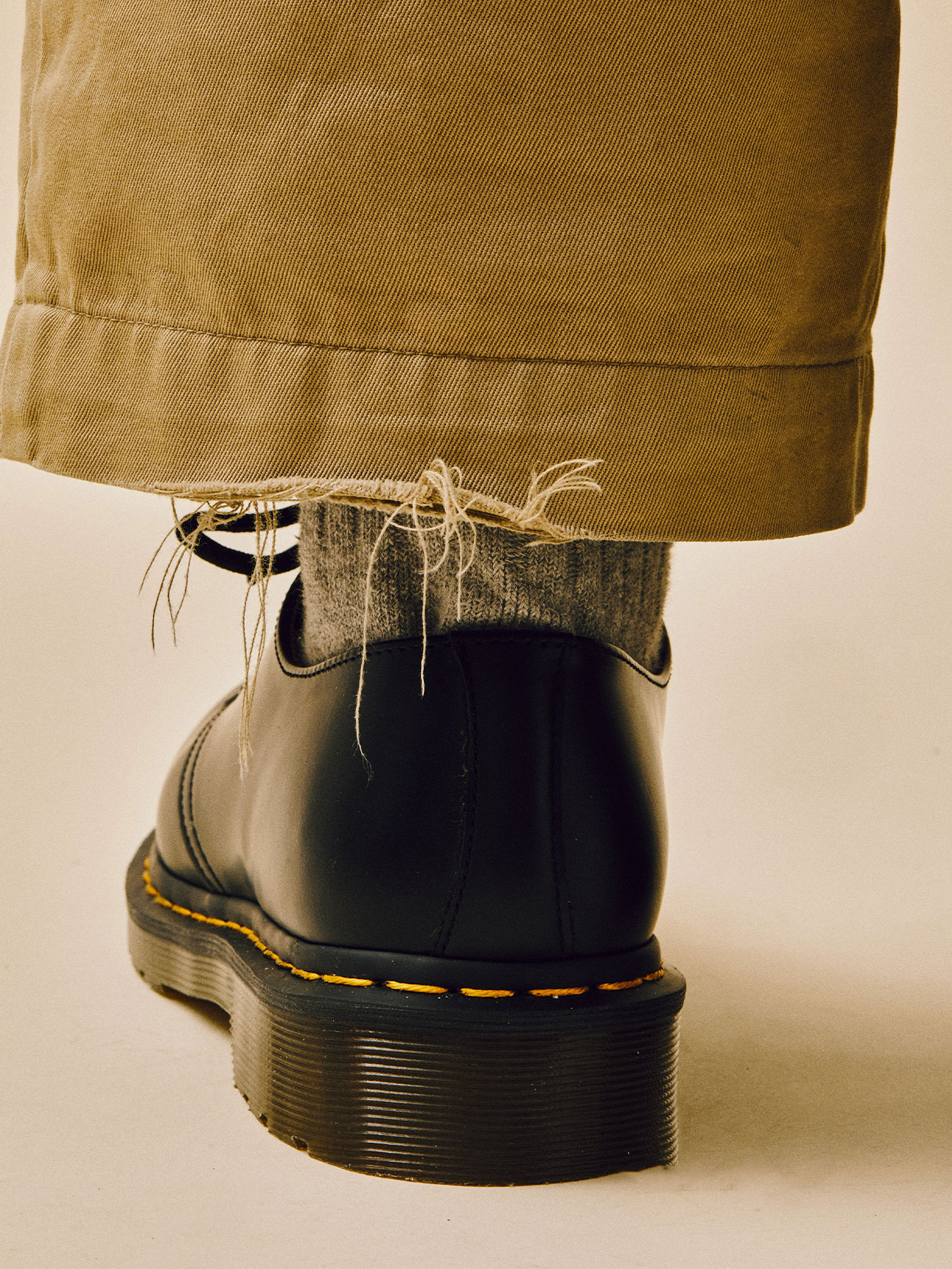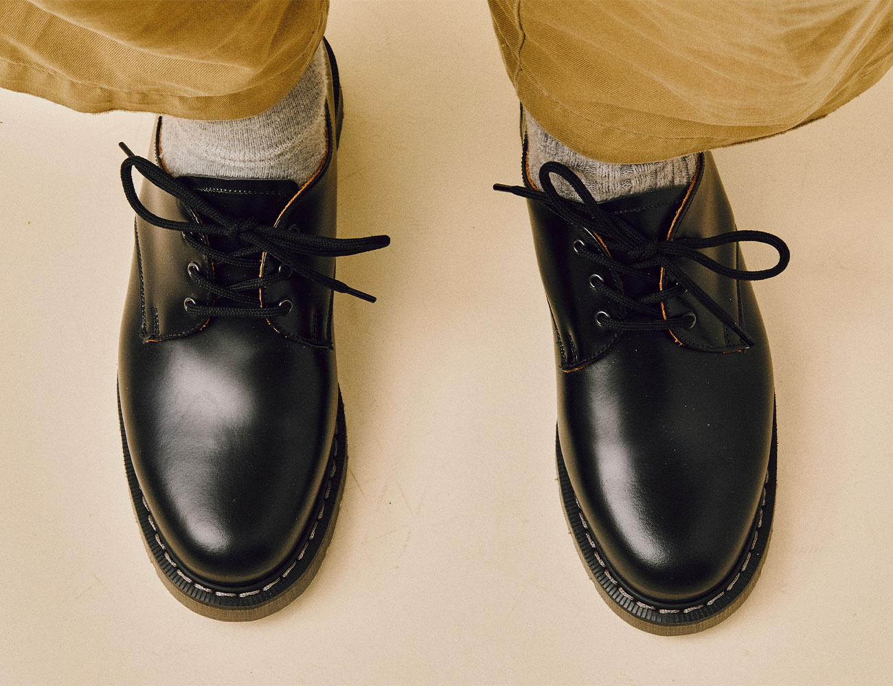 Solovair 3 Eye Gibson: Solovair’s English-made style can blend well in situations that have a tightened-up dress code. The sculpted silhouette, tonal welt stitching and tonal soles impart the shoe with a certain sleekness that the 1461 doesn’t quite have. That’s not to say you couldn’t wear the Solovair’s in casual situations, but if you find yourself in need of a shoe to go with a suit, these could pass.