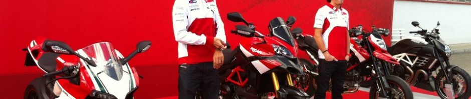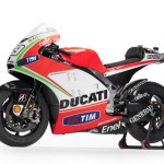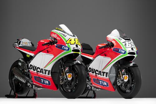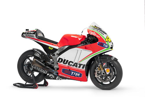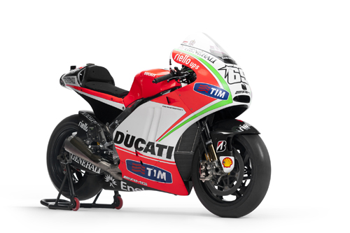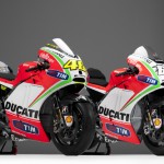 Did anyone catch the hour-long online presentation this morning? Ducati Corse finally unveiled the official paint scheme of the perimeter frame Ducati Desmosedici GP12 from company headquarter’s in the Bologna suburb of Borgo Panigale. If you missed it, riders Valentino Rossi and Nicky Hayden tweeted photos of the bikes in the red, white, and green colors of the Italian flag, not long after Ducati released the official studio photos.