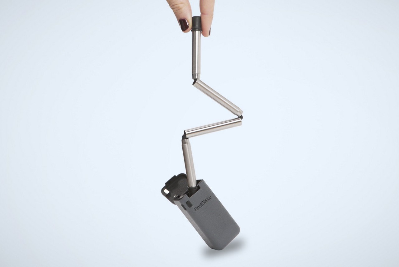 The BPA-free, dishwasher-safe straw is made of stainless steel with medical-grade TPE tubing. It weighs 2.8 oz and folds down to fit in a case the size of a lighter which also holds a thin squeegee to help you keep FinalStraw clean on the inside. The case can easily be attached to your keys, so you never leave home without your personal sucking device.