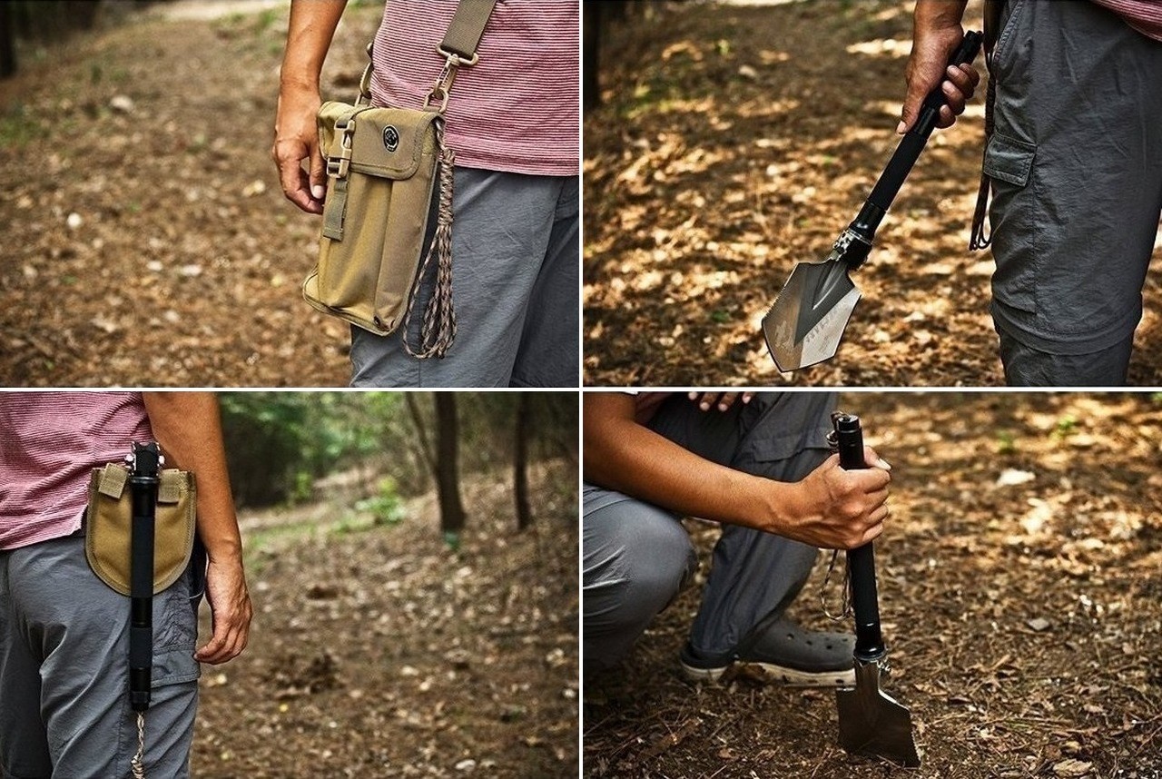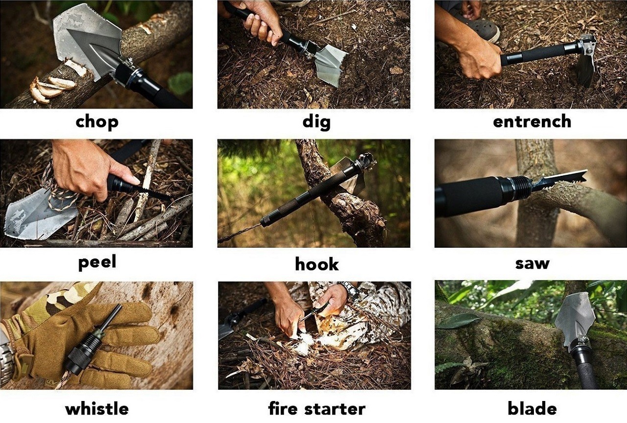 Forged from 420 high carbon steel (primarily used for making knives and axes), the rust/water resistant shovel features a screw locking mechanism that allows it to be used at 40°, 90° or 180° angles as either a hook, hoe or shovel. The versatile survival tool has a sharp axe blade, serrated saw edge & hammer edge.