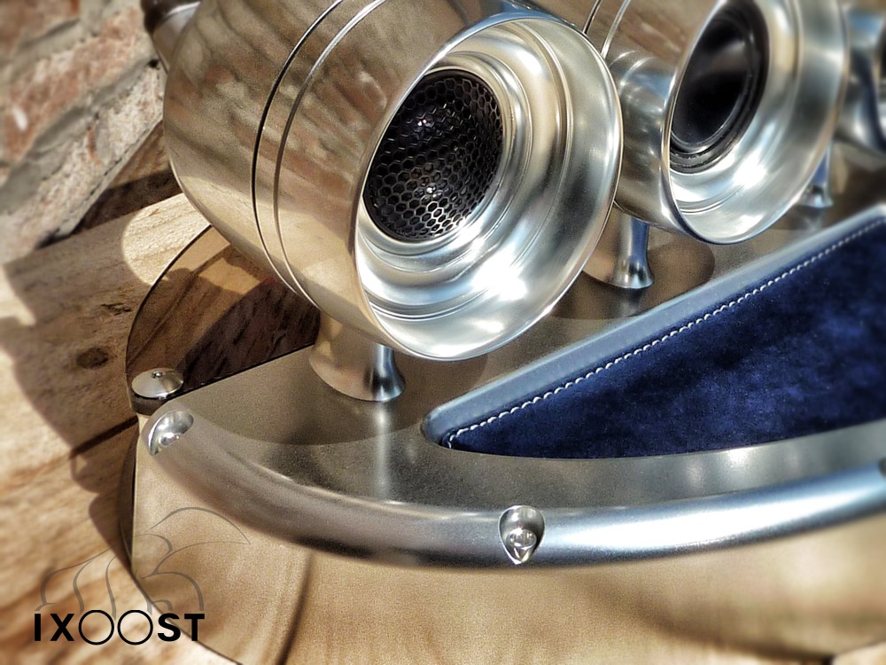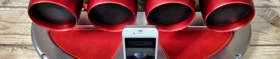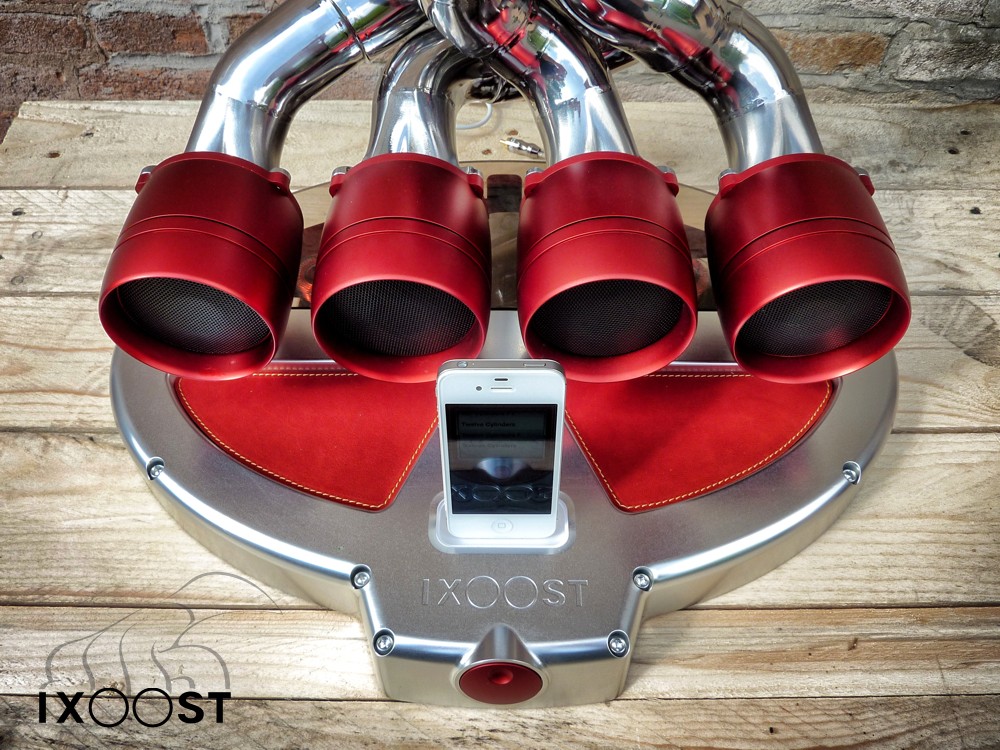 Dreamed up by Matteo Panini and designed by Mirco Pecorari, iXoost builds beautiful audio systems out of Formula One exhaust manifolds. Their iPhone/iPod docking system comes in 8-, 10-, and 12-cylinder models, and features 420 watts of power behind either six or nine separate speakers.