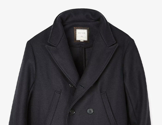 “Made in Italy, the double-breasted coat features a tailored fit, horn buttons, a single vent and leather detailing under the collar.” — John Zientek