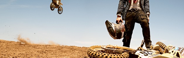 Jacket, $725 by Belstaff at mrporter.com. Sweatshirt, $373 by Pierre Balmain. Scarf, $38 by Tommy Hilfiger. Jeans, $595 by Ralph Lauren Black Label Denim. Sneakers, $880 by Balmain Homme. Vintage belt by Melet Mercantile. Watch by Raymond Weil. Helmet by Fox Racing.