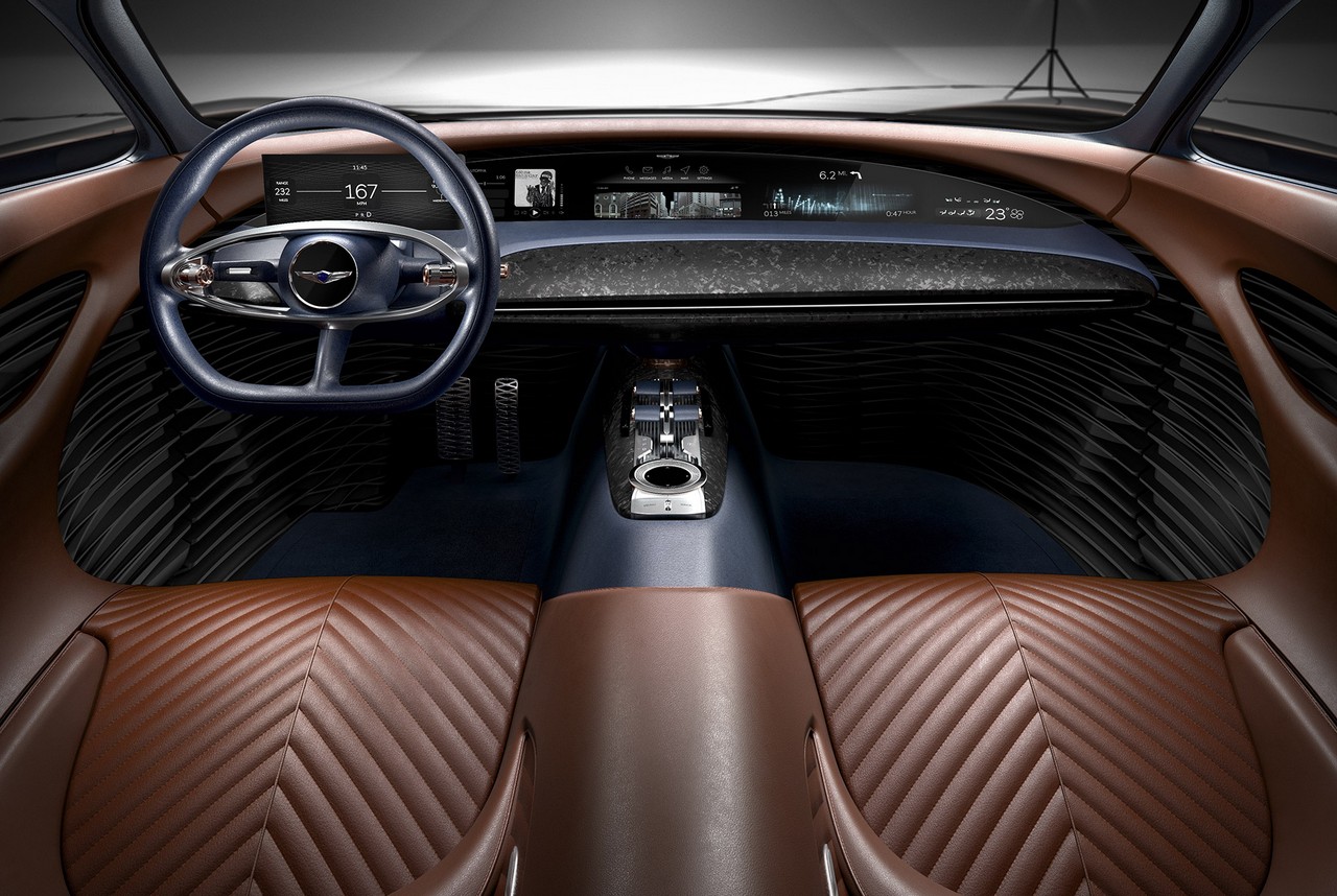 The equally impressive interior is wrapped in Oxford Blue and Cognac leather and sports an elegantly shaped digital dashboard.