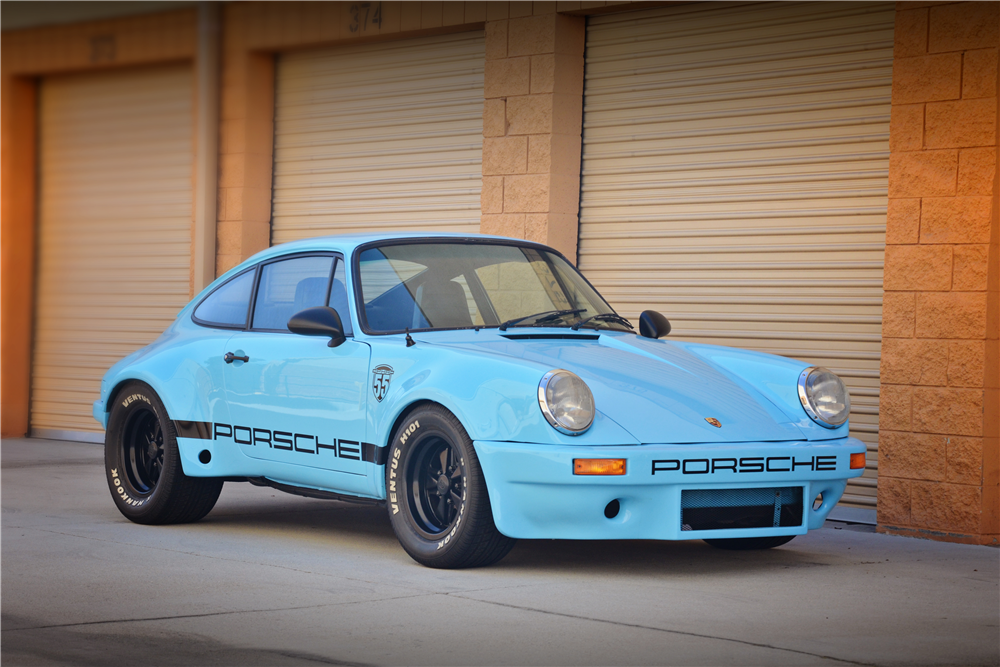 We found this beautiful blue 911 on barrett-jackson.com. This custom 1971 911T has a Certificate of Authenticity from Porsche. Approximately 77,092 miles (mileage not indicated on title) on the matching-numbers factory 2.2-liter engine matched to a 5-speed 901 manual transmission and Dansk headers connected to megaphone pipes. The engine runs strong and clean on the car, which has had a fresh, high-end respray of the stunning factory color of Pastel Blue (per the COA), contrasted by black vinyl decals and black powder-coated Fuchs wheels with new Hankook white-letter tires – stanced perfectly under steel, butt-welded, Turbo fenders. Very clean interior.