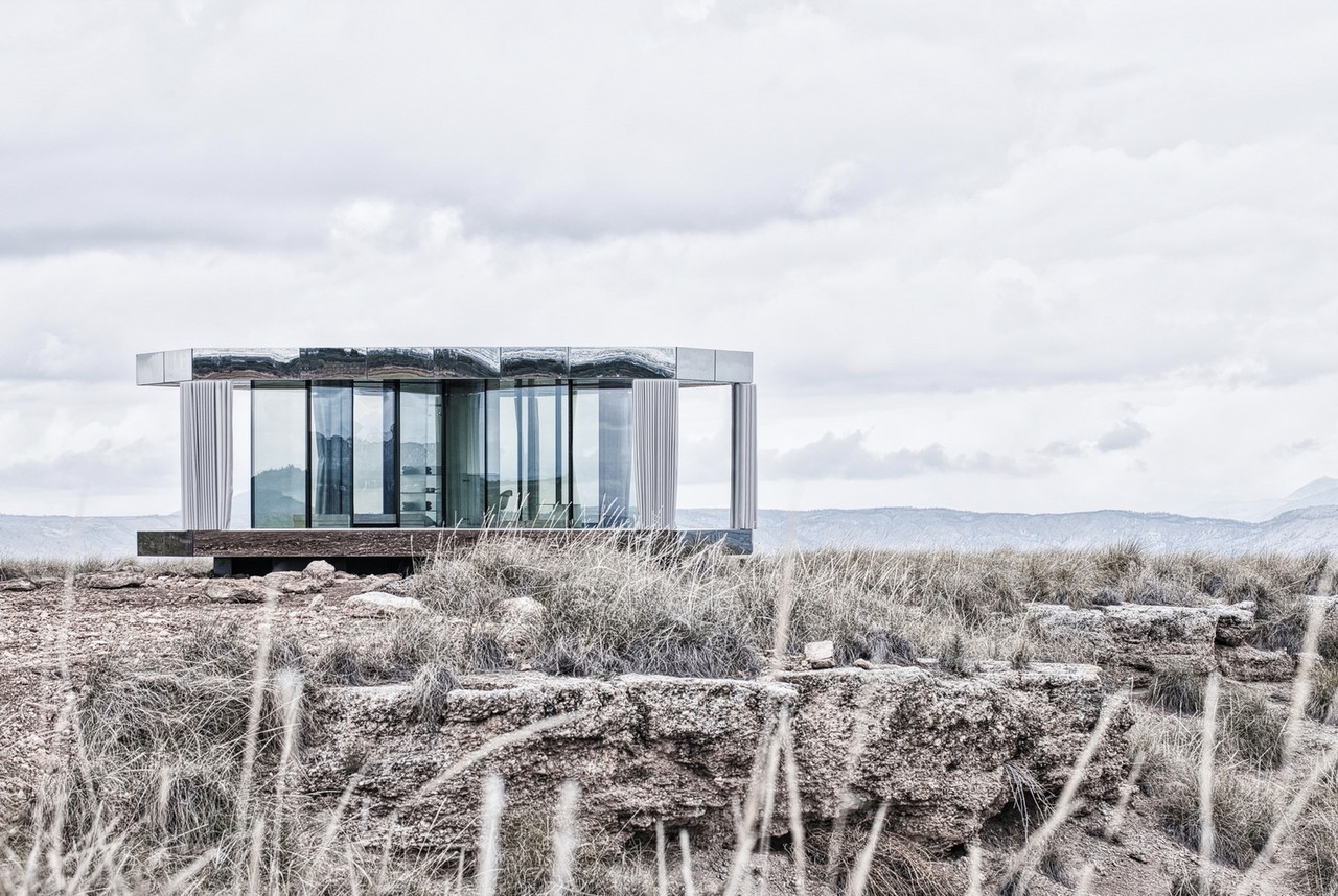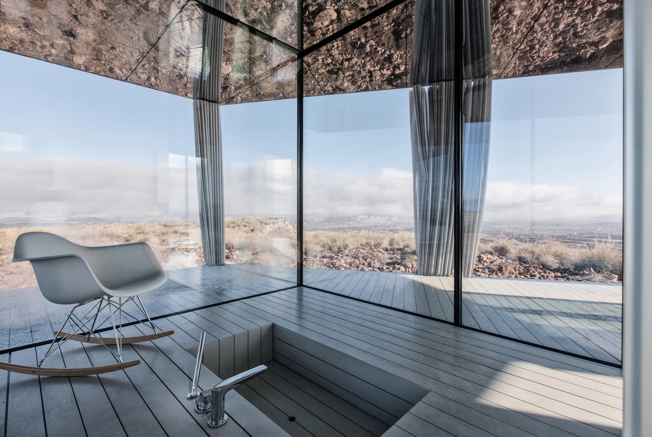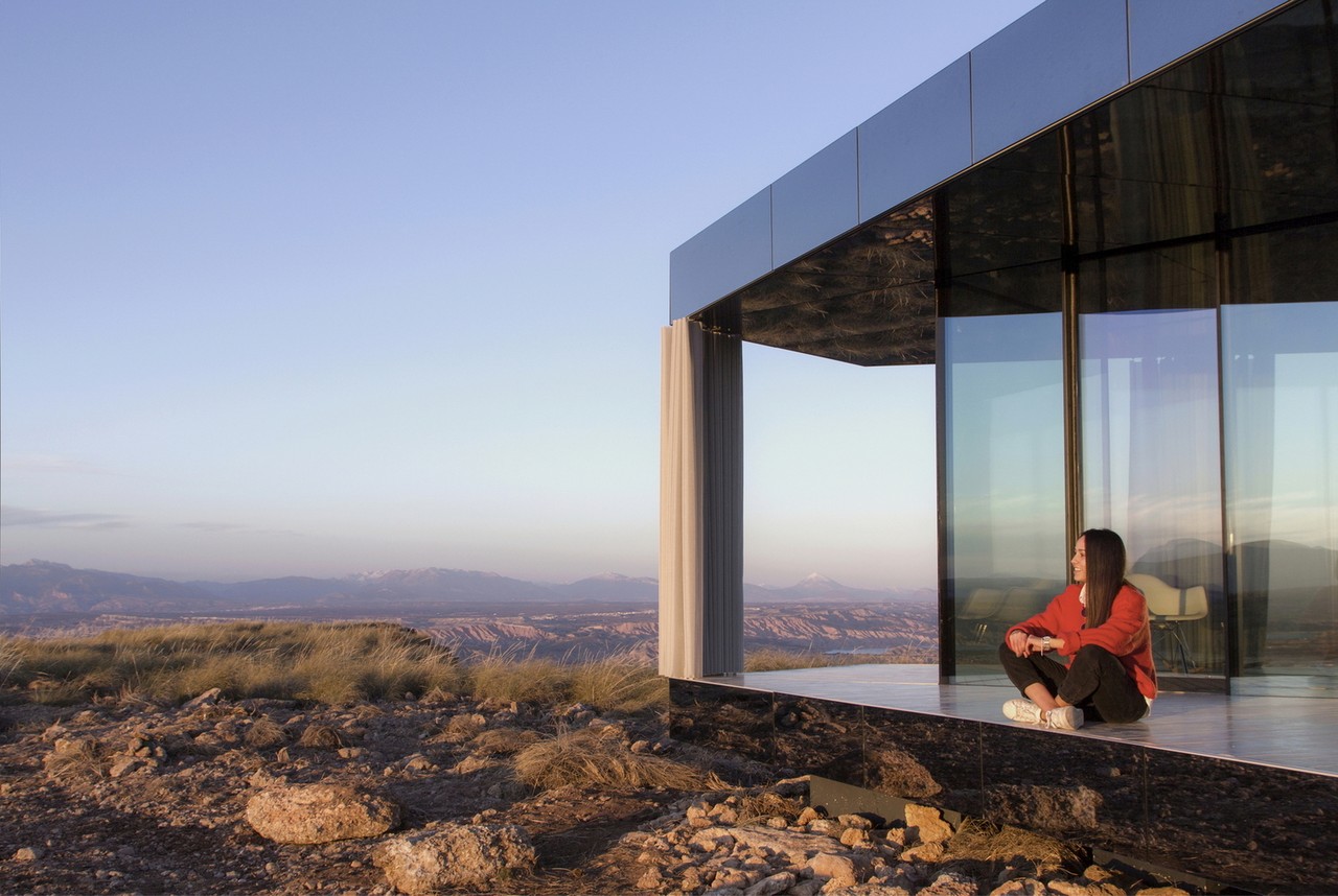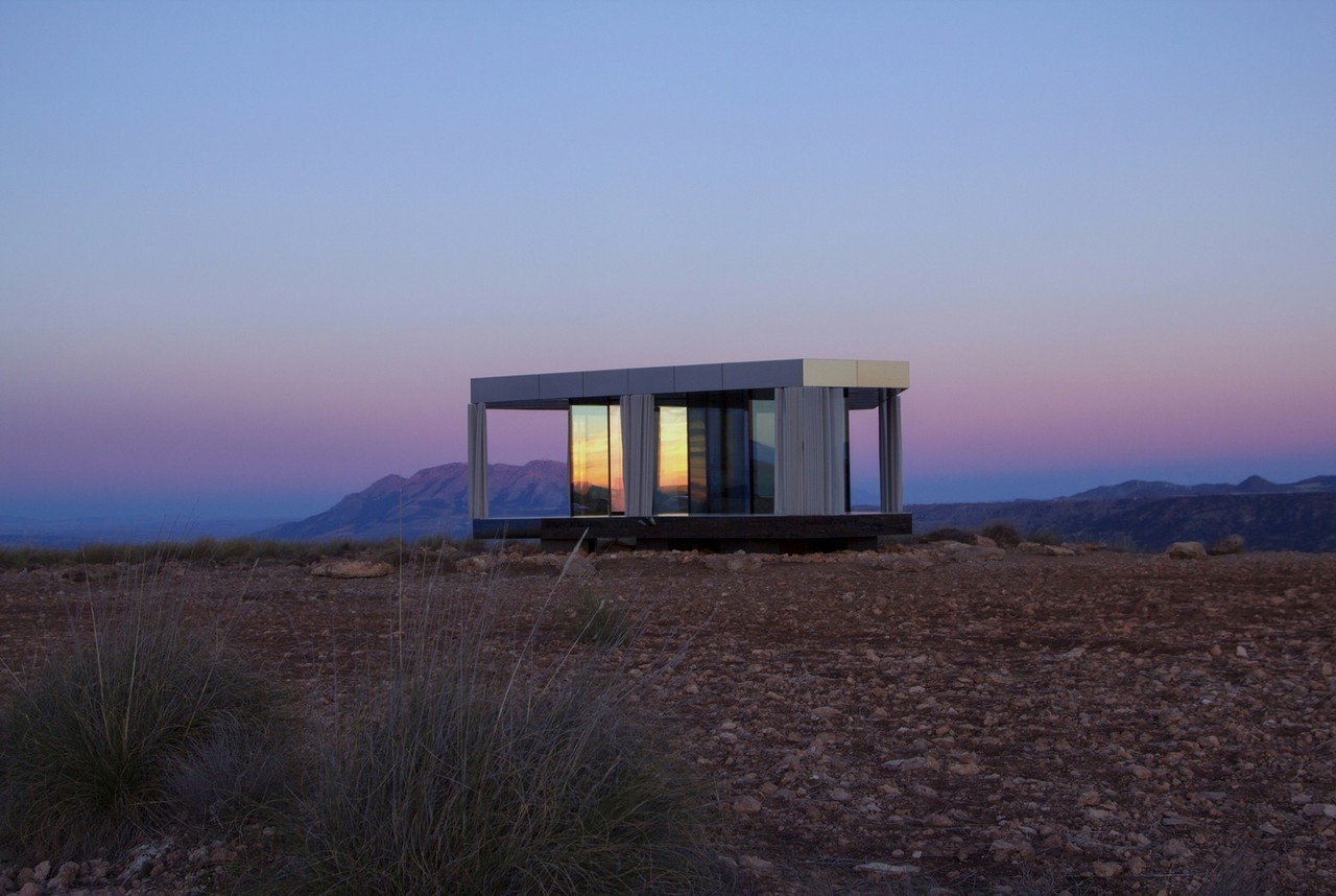 Set in Spain’s Gorafe desert, the unit uses vertical glazing walls as the sole structural support under the timber stressed skin roof. The triple glass glazing is treated with almost invisible coatings, protecting the interior from the sun and offering thermally efficiency. Inside, there’s a bedroom, living area, and bathroom, with all of the spaces giving access to a covered porch and affording stunning, uninterrupted 360° views.