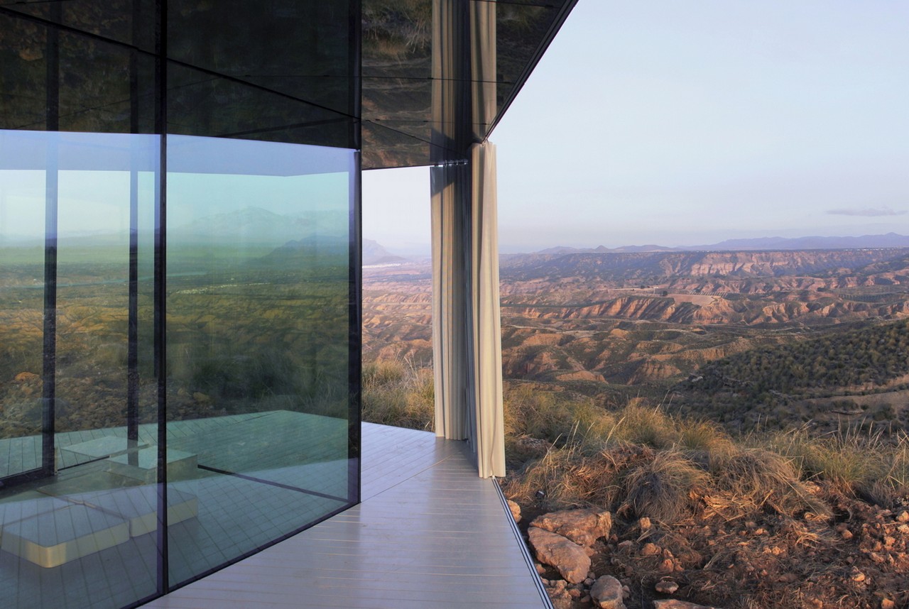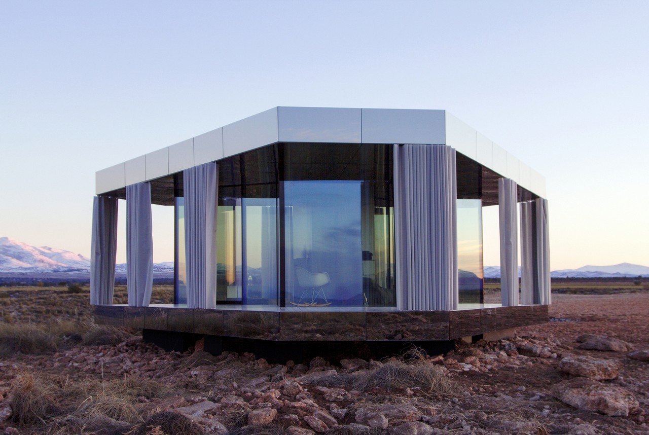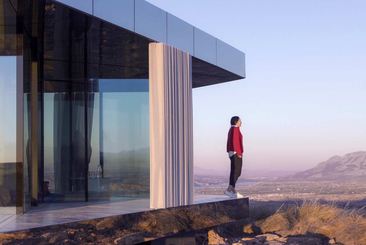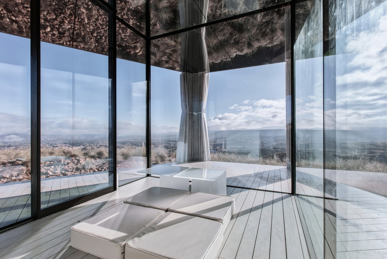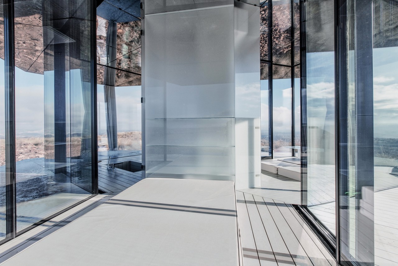 Set in Spain’s Gorafe desert, the unit uses vertical glazing walls as the sole structural support under the timber stressed skin roof. The triple glass glazing is treated with almost invisible coatings, protecting the interior from the sun and offering thermally efficiency. Inside, there’s a bedroom, living area, and bathroom, with all of the spaces giving access to a covered porch and affording stunning, uninterrupted 360° views.