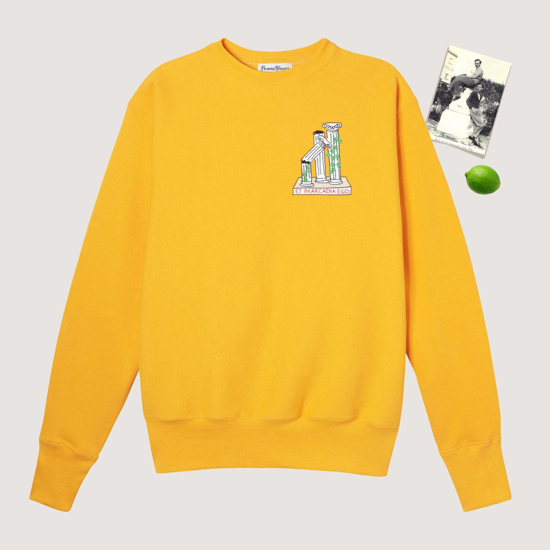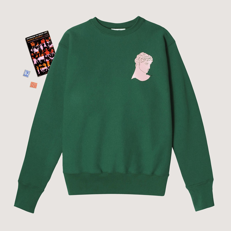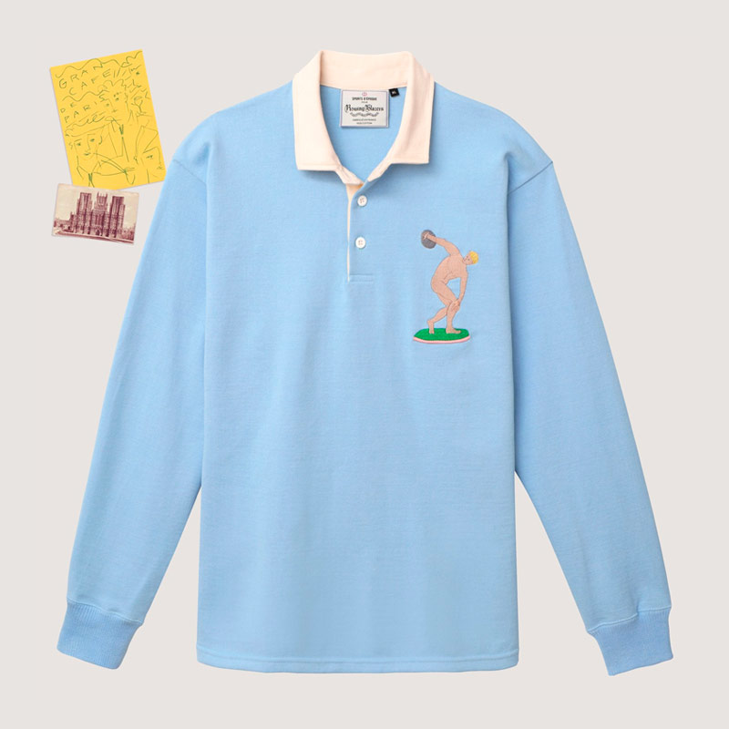 In the collaboration, you’ll find everything from a corduroy dad cap with an embroidered bust on it, to a sweatshirt bearing time-worn ionic columns. The pieces range from $25 for a standalone patch to $185 for a heavy cotton rugby shirt whose construction mimics the original jerseys worn when the game was invented.