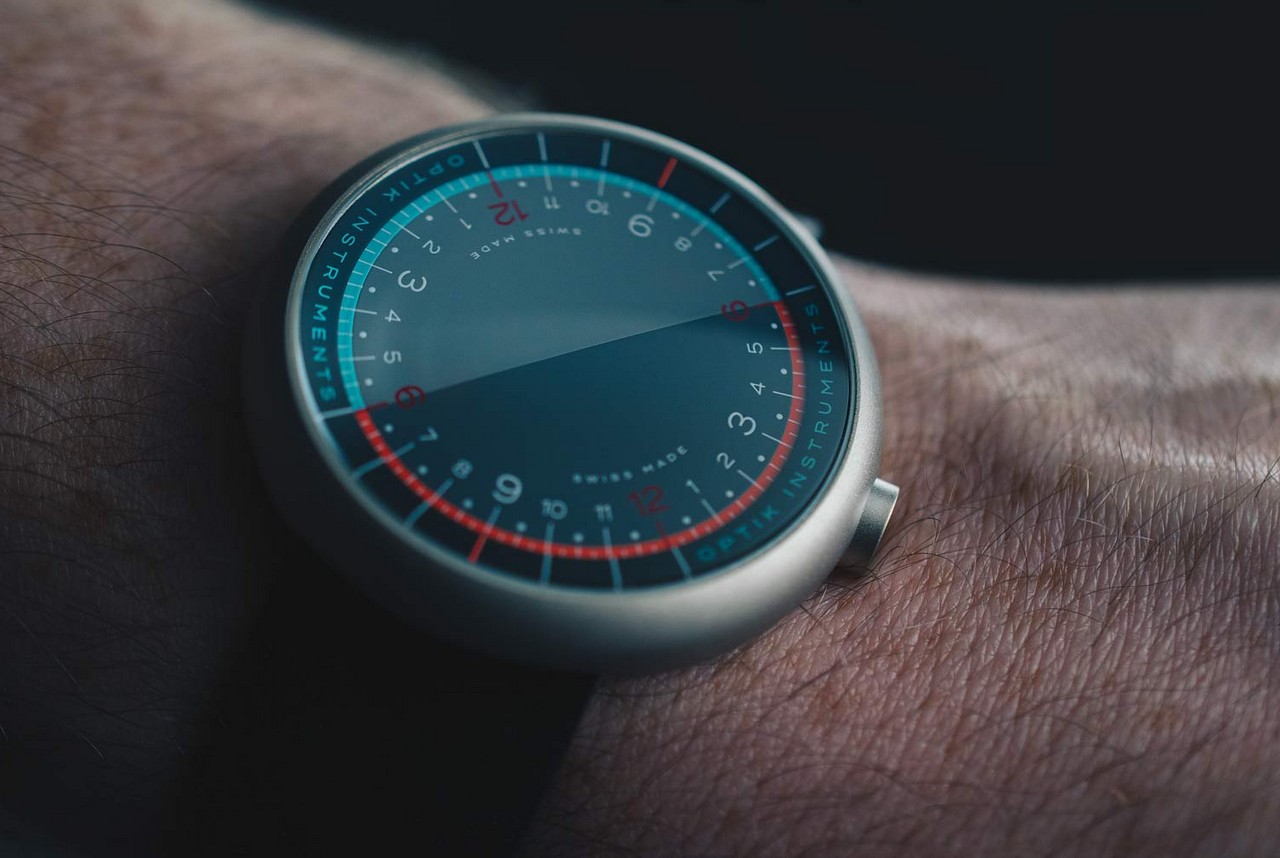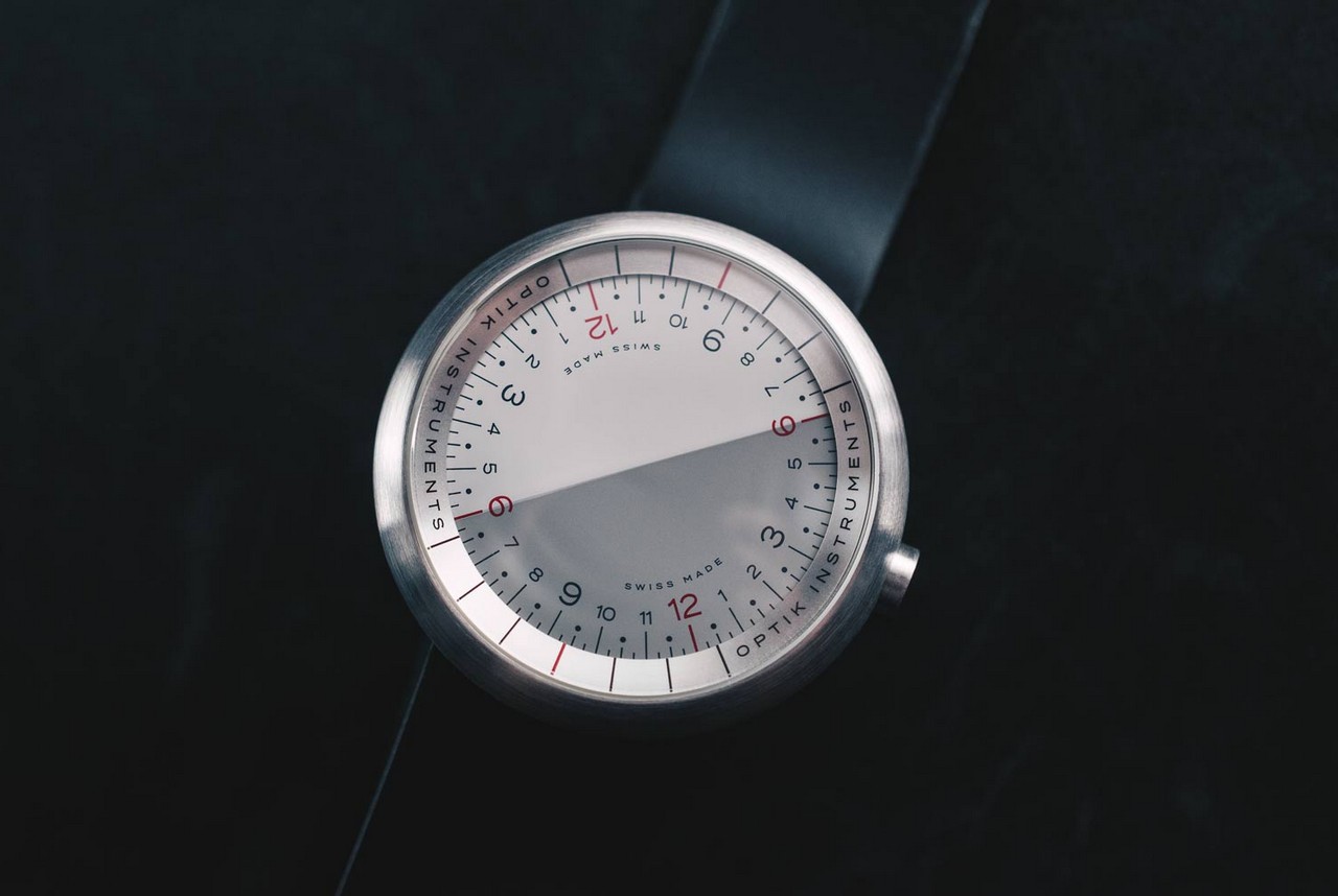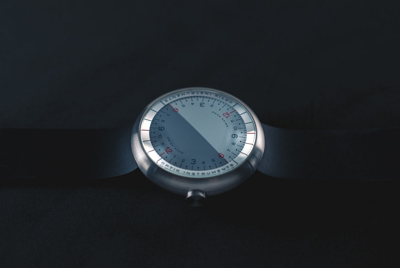 Created by OPTIK INSTRUMENTS, a young British design house “driven by a slow-living culture,” the striking watch features a smooth, rounded stainless steel case with a domed sapphire crystal. The integrated crown adds to the seamless look, while a battery-powered movement is suspended in the case with a unique engagement frame, allowing the disc to rotate freely and helping with shock resistance.