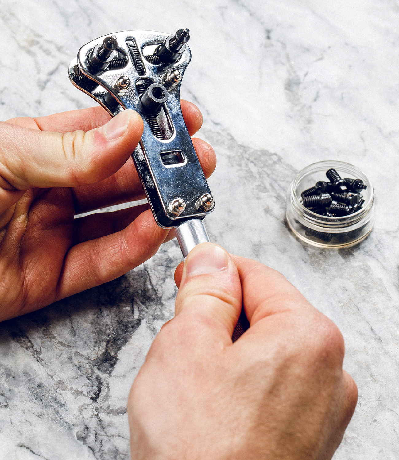 Acquire The Appropriate Tools. While you don’t need to invest hundreds of dollars in the grade of tools that the pros use, there are a few things that are essential if you want to open your own case back (see the Buying Guide below). At minimum, a friction ball, case back wrench, case holder and common shop vice will make your life easier (you could conceivably do without the case holder and vice, but if you want to drastically reduce the likelihood of scratching a case back, we highly recommend them. Besides, you should have a shop vice lying around already – what kind of man doesn’t have a shop vice?)