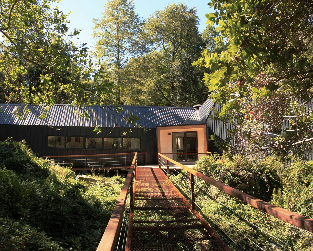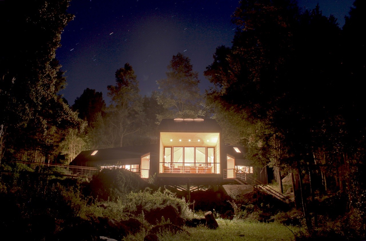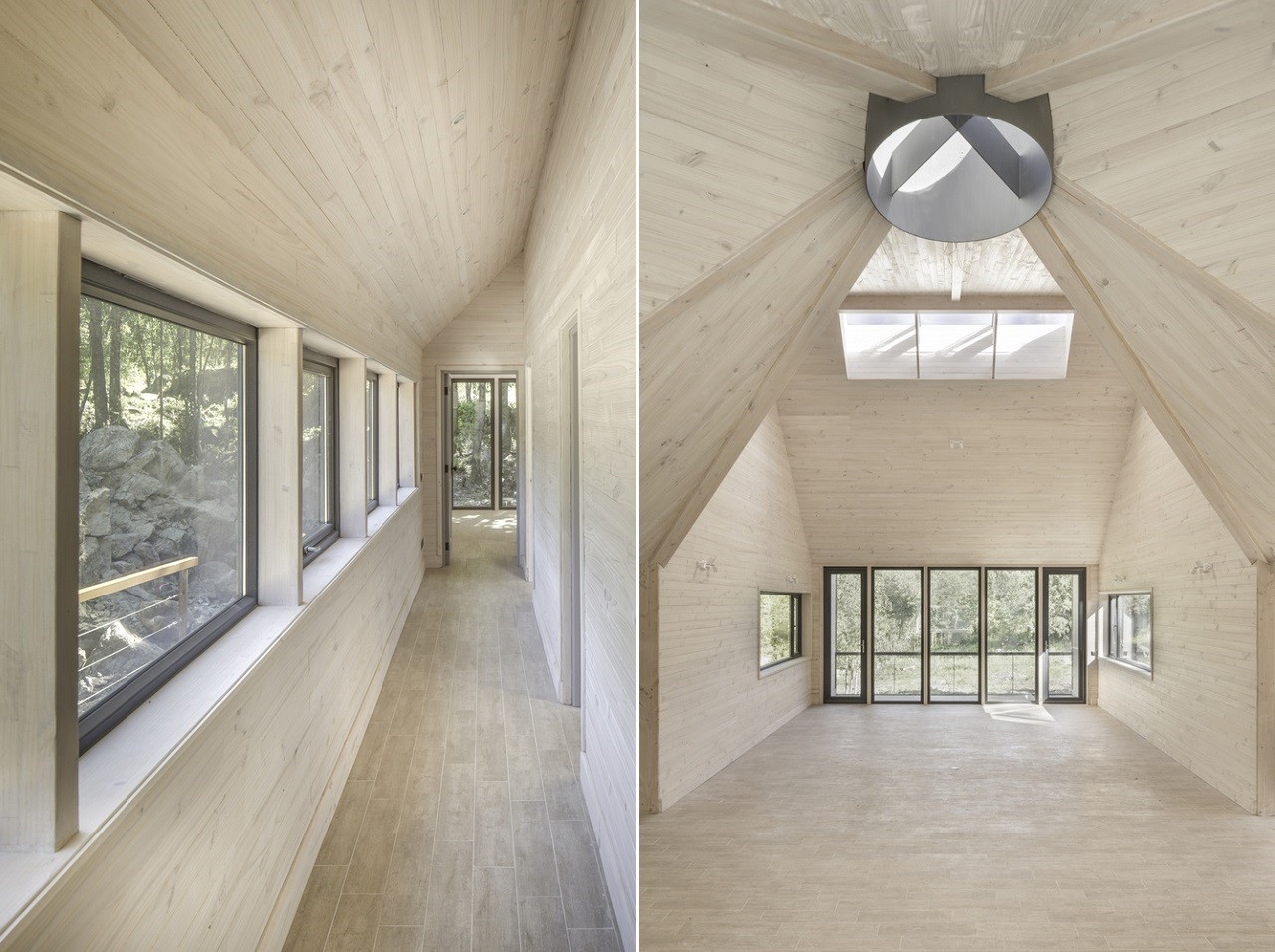 Designed in a “Y” shape in order to capture natural light and maximize views from all of its rooms, the dwelling is perched over the rocks, safe from the flow of water, in a sunlit forest glade. Entering the shelter is done via a rusty steel footbridge. The bedrooms and private spaces inside are simple and unadorned, with open, spacious public areas to accommodate a large family.