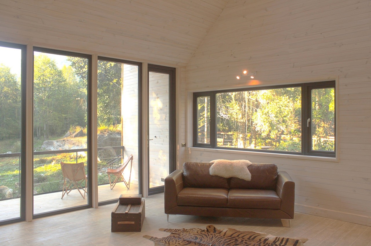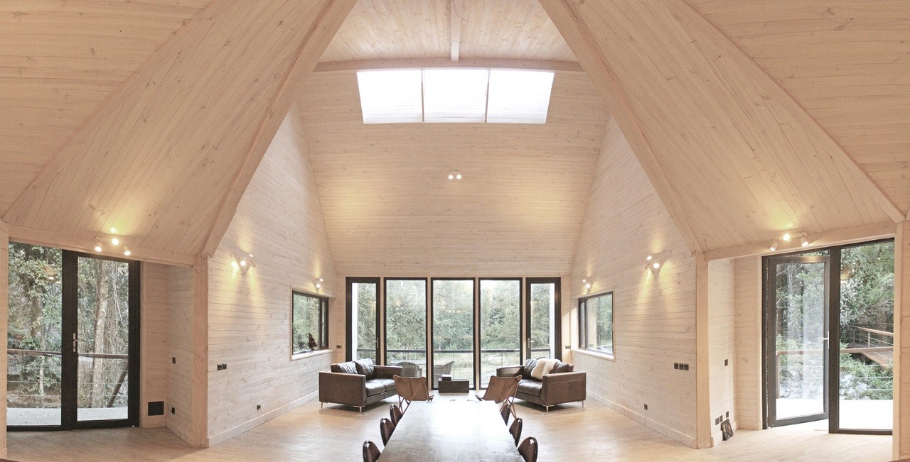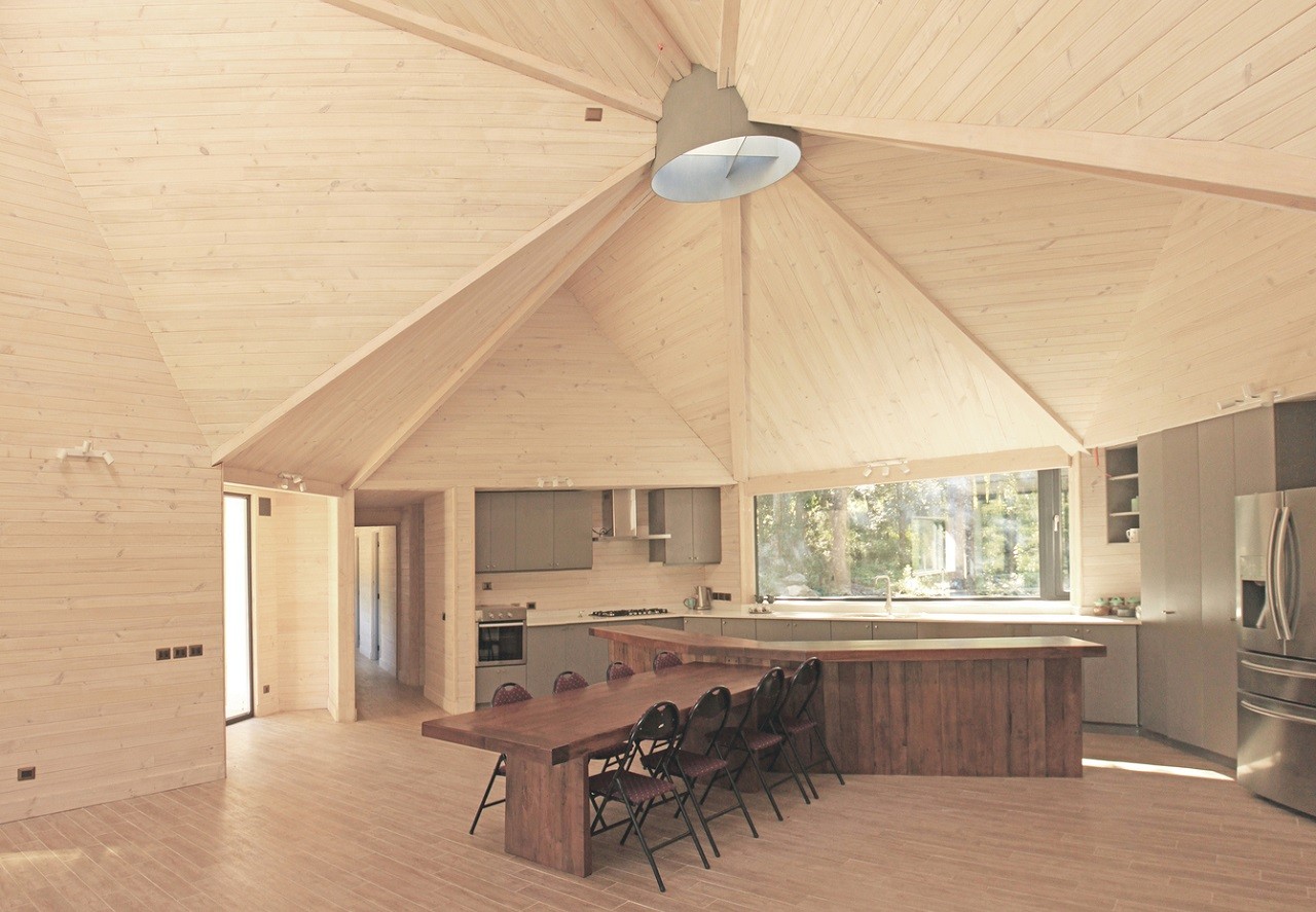 At the north point of the house, there’s a master bedroom looking towards the forest; the west axis includes children and guest rooms, while the east end contains a living/dining room that offering views of the forest glade and the mountains beyond. In the center, where all axes converge, a spacious and sun-bathed kitchen provides a place for the whole family to come together.