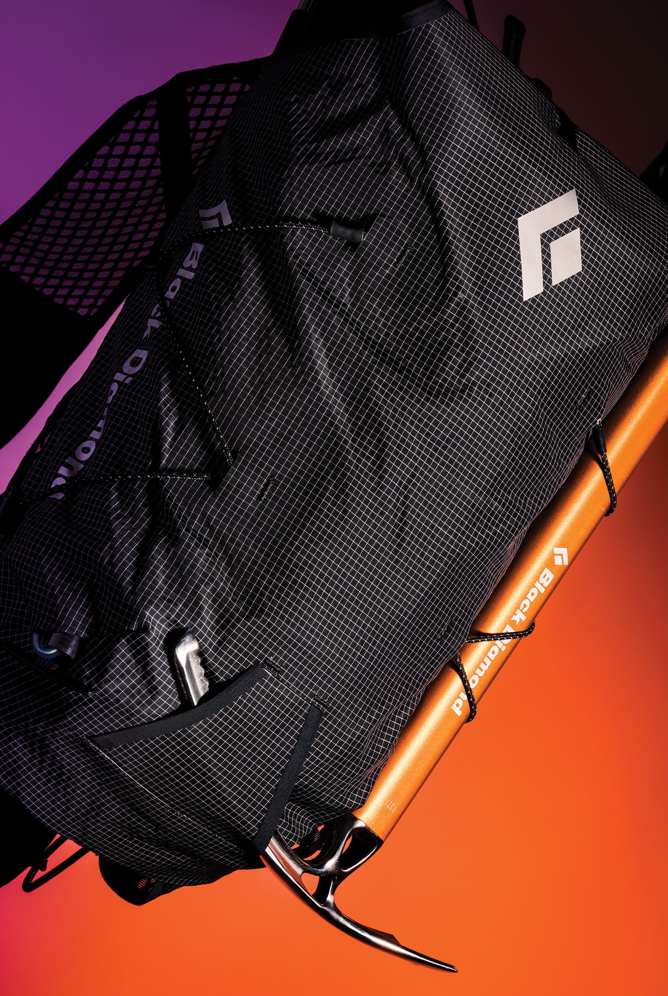 “So the idea for the pack was to have it be runnable but also keep all the alpine components — a more durable fabric, ice-axe attachments, a really sleek way to stash poles once you start to climb or scramble. We wanted to maintain Black Diamond’s mountain DNA so that it wouldn’t just be another running vest on the market, and also not a regular climbing back. A true hybrid.