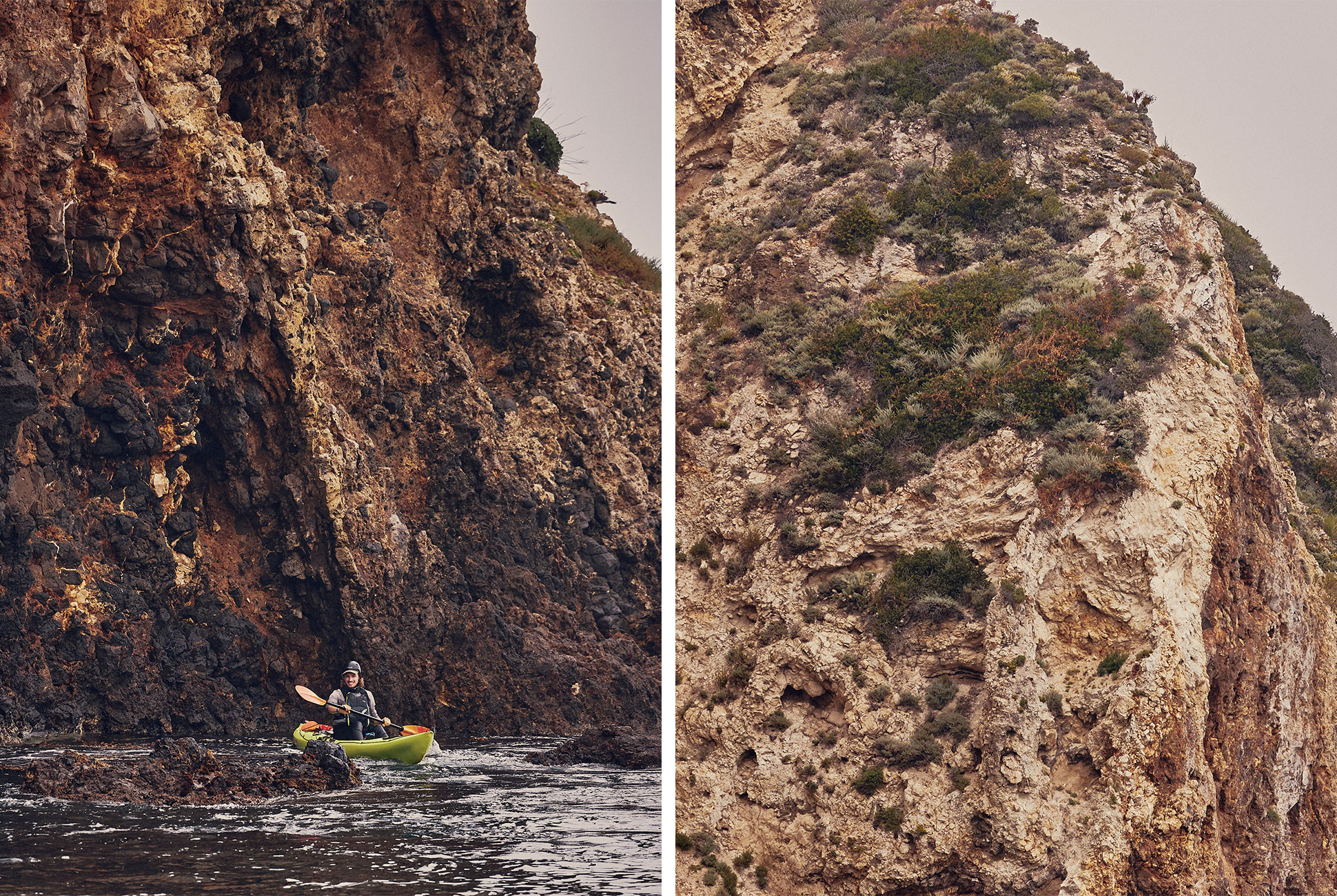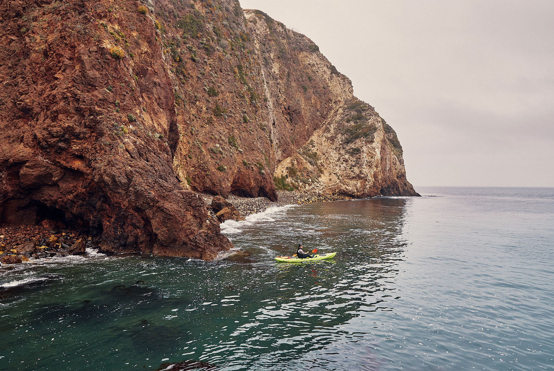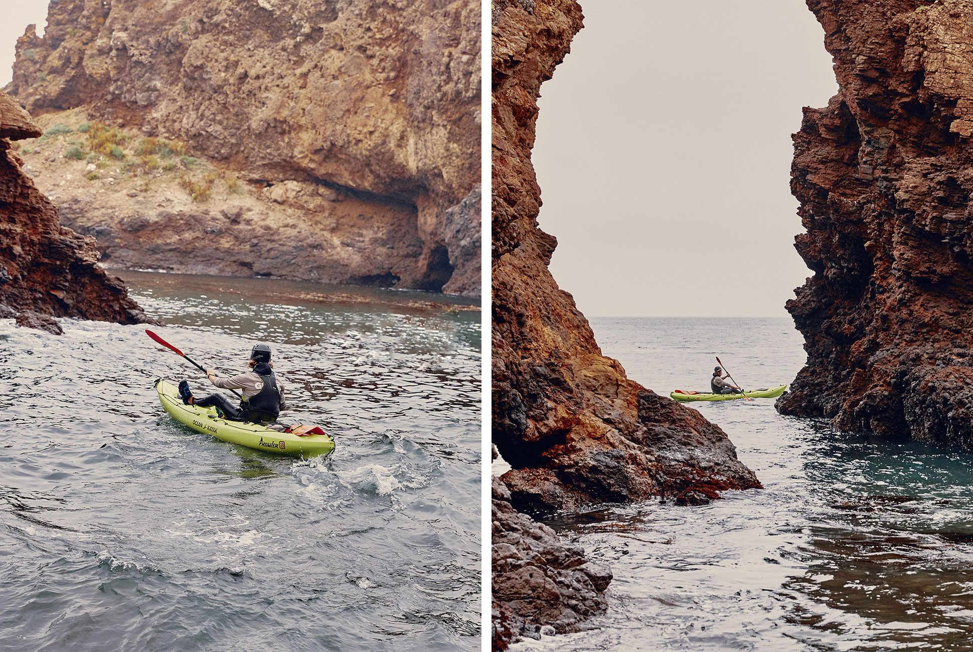 On tap for an off-duty afternoon: a big bite of that grandiose adventure. Phillips suits up in his Xcel Drylock wetsuit, NRS Ion personal flotation device, and Adidas Terrex Voyagers and is pushing his kayak off into Scorpion Bay ten minutes later. As he paddles past the breakers and through the canopy of a massive kelp forest, perched in one of SBAC’s Ocean Kayaks, he points out the gnarliest of the island’s 250 sea caves. “When I’m guiding clients, I spend all my time making sure everything goes smoothly,” he says. “When I’m out here on my own, the fun is getting yourself into the bad spots, and then getting yourself out.”