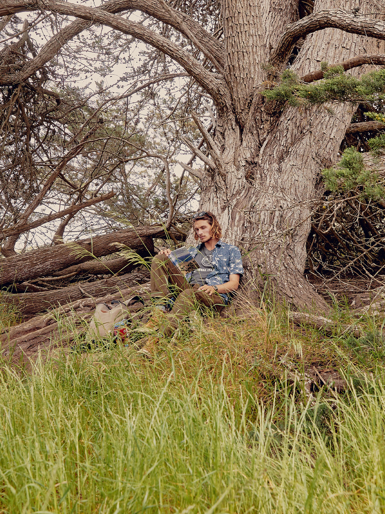 Later, Phillips ditches the kayak gear, grabs a Nalgene and a book — The Geology and Landscape of Santa Barbara County and Its Offshore Islands — from the guide shack, and hikes up to Delphine’s Grove, a stand of Cyprus trees overlooking nearby Anacapa Island. He sits down in a shady spot and munches on a cookie. “I always have lots of stuff in my head, from working all the time, and when I’m not working, from finding exciting shenanigans to do,” he says. “When I’m by myself, it’s nice to just quiet my mind. That takes more energy than one might think.”