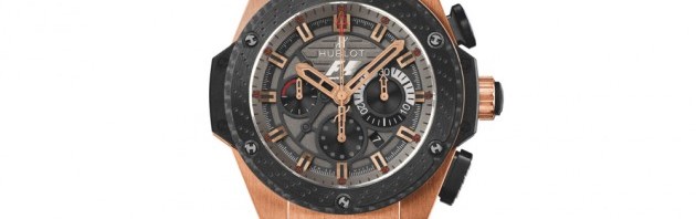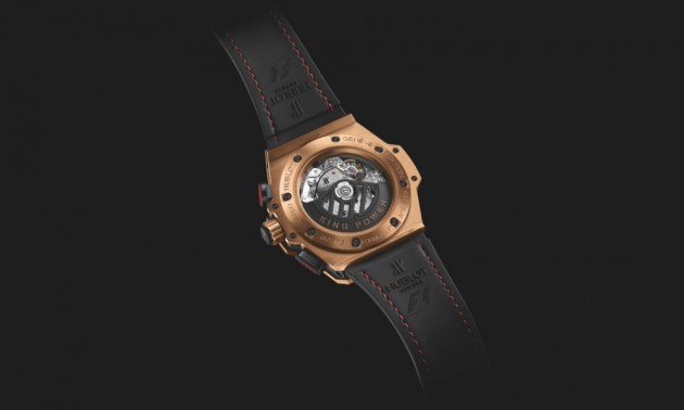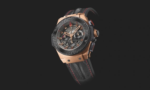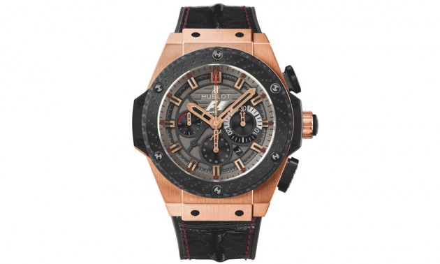 The watch is a limited edition with 250 numbered pieces. The F1 King Power Great Britain isn’t your average piece. It’s executed in a range of high-tech materials directly inspired by Formula 1, such as the carbon fiber and ceramic bezel with a circular-grained satin finish, adorned with multiple holes evoking a high performance brake disc, push-buttons for starting and resetting, and a 30-minute to 3-hour counter. The strap is made from black alligator horn back stitched onto black rubber, with red stitching. Fusion of the materials, the case is made of 18K King Gold – the type of exclusive 18 carat gold alloy used by Hublot – which is even redder than the traditional 5N red gold.