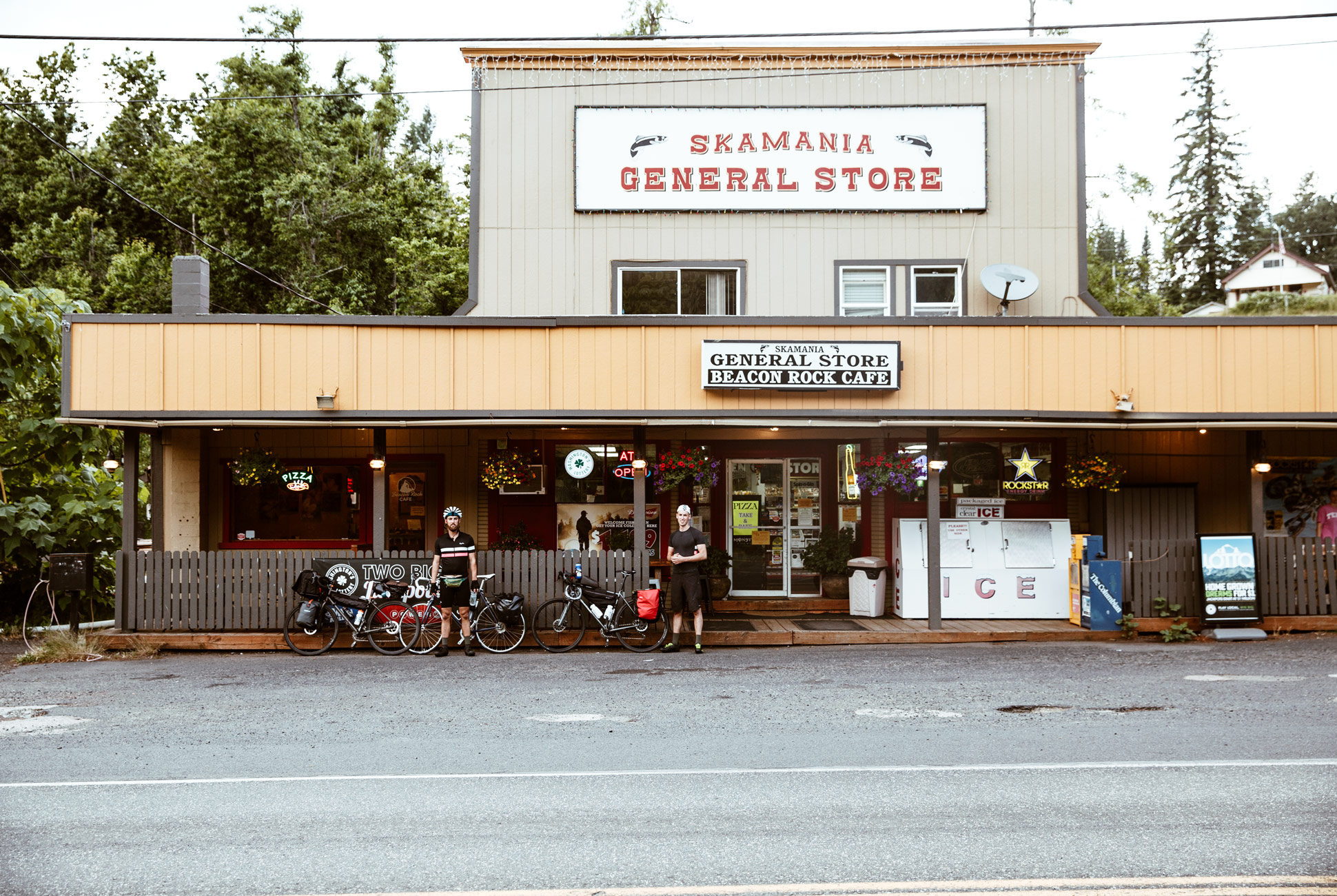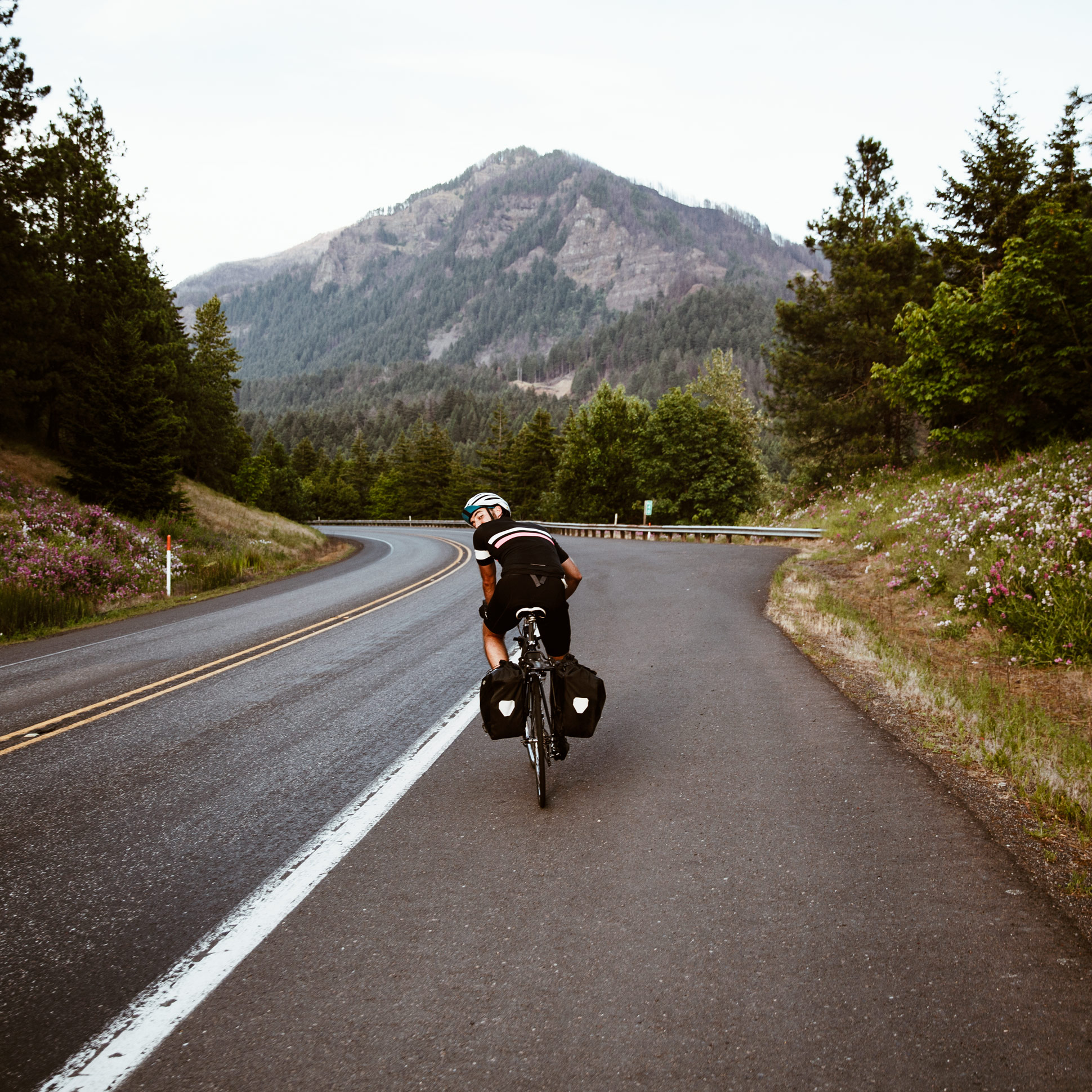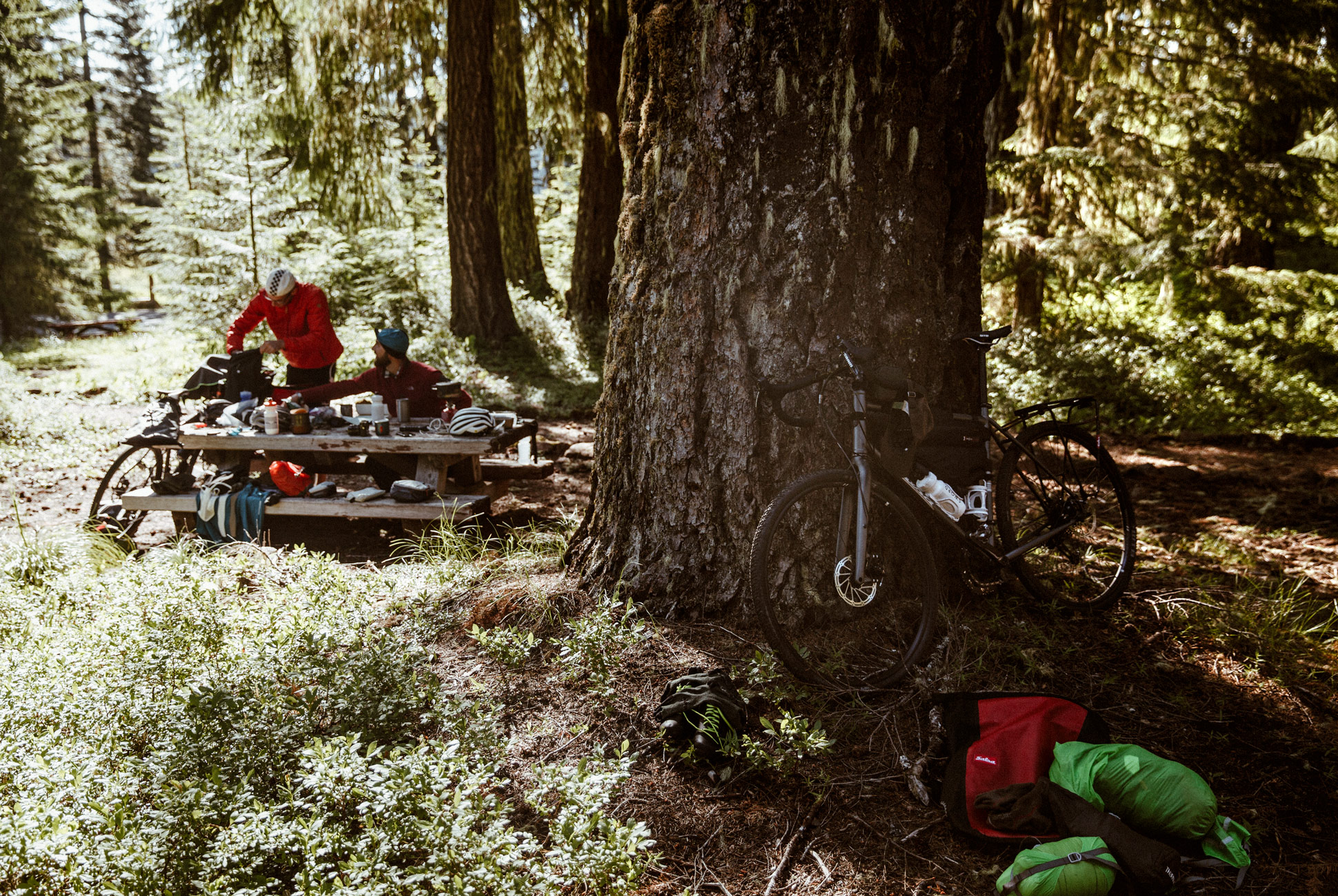 I boxed-up my Salsa Vaya Apex touring bike and boarded a plane in mid-June. In addition to ample beer and pie purveyors, there are plenty of bike shops in Portland, including Crank, where I went for last-minute tuning. We screwed on our rear racks, installed our Salsa panniers, and took off in our Rapha onesies: bike touring triplets. The Vaya is ultra-light for a touring bike, but mine was saddled with thirty pounds of gear: food, tools, tubes, clothes, sleeping and eating stuff. I was especially excited about a few items: my MSR Hubba Tour 2 tent, which sleeps two (brothers) and has a vestibule big enough for a pair of bikes; Giro’s Empire VR90 superlight mountain bike shoes; and a Goal Zero solar-charging panel to keep my phone alive (for mapping, not email) while riding in remote areas.
