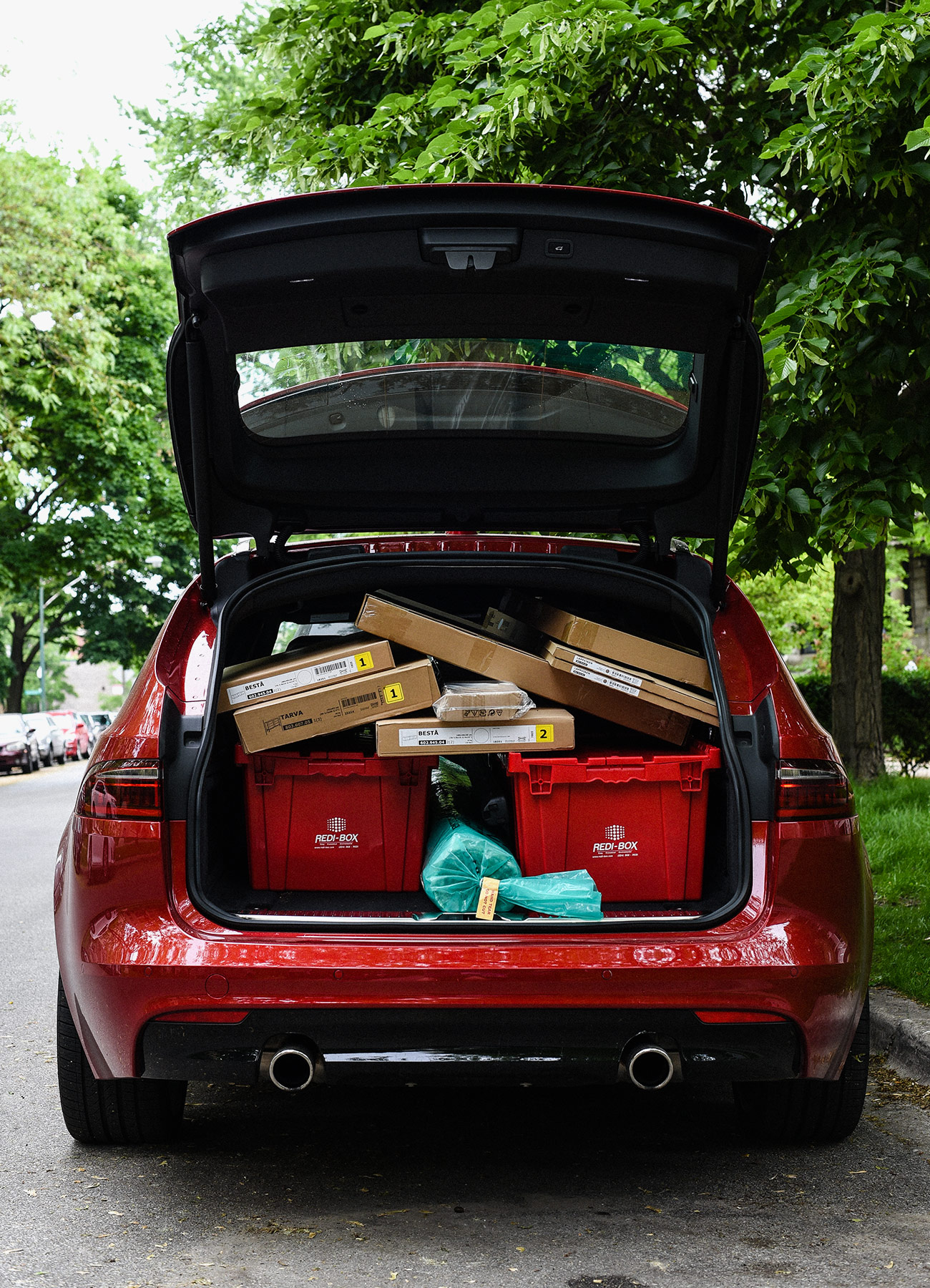 But moving with the Sportbrake showed me how remarkable its domestic chops are. When in its normal driving mode it soaks up the pits in Chicago’s horrid roads with ease and slides in and out of traffic with smooth, unadulterated grace. Its supple, ventilated seats made muggy end-of-May weather easier to bear, while its brilliant Meridian sound system was truly a joy to listen to. Best of all, its cargo bay, especially with the rear seats down, swallowed up a surprising amount of my things. Here’s a list of crap that went in it in one trip — a reference, if you’re familiar with the brand, of how much I hauled.