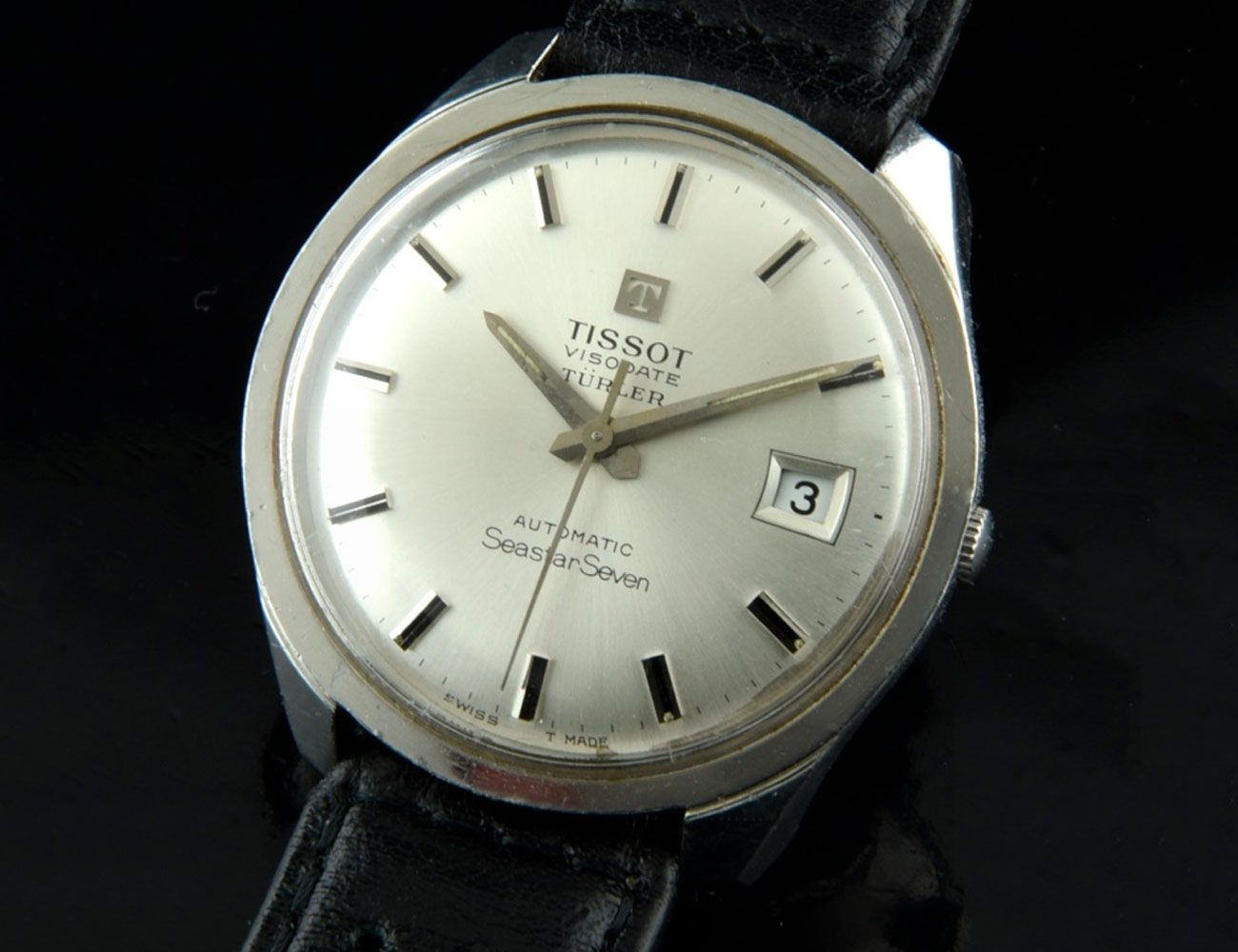 From the seller: Notice the asymmetric date aperture, pencil hands and very clean original dial. The 35mm. steel case with recessed crown and down-turned lugs looks very good. The automatic winding TISSOT movement was just cleaned and is accurate.