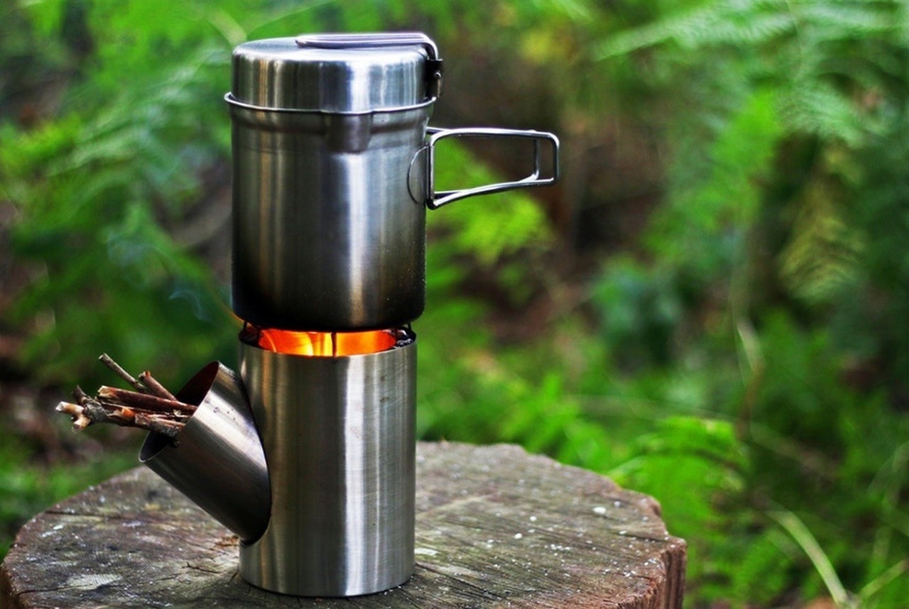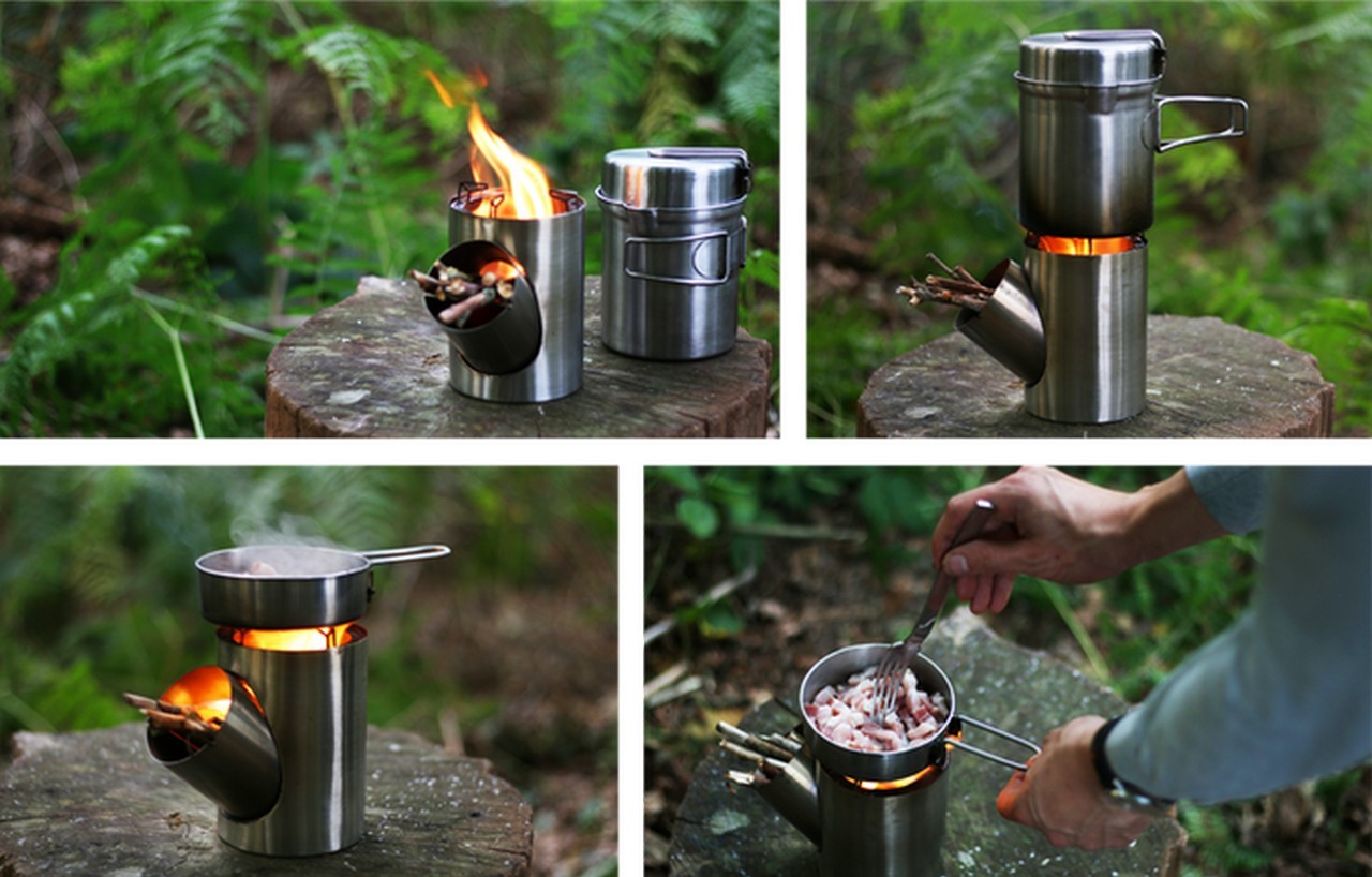 The Kombius is a compact, no-frills outdoor cooking set that includes a pan, a pot/carry container, and a stove that burns sticks, twigs and other biofuels.
