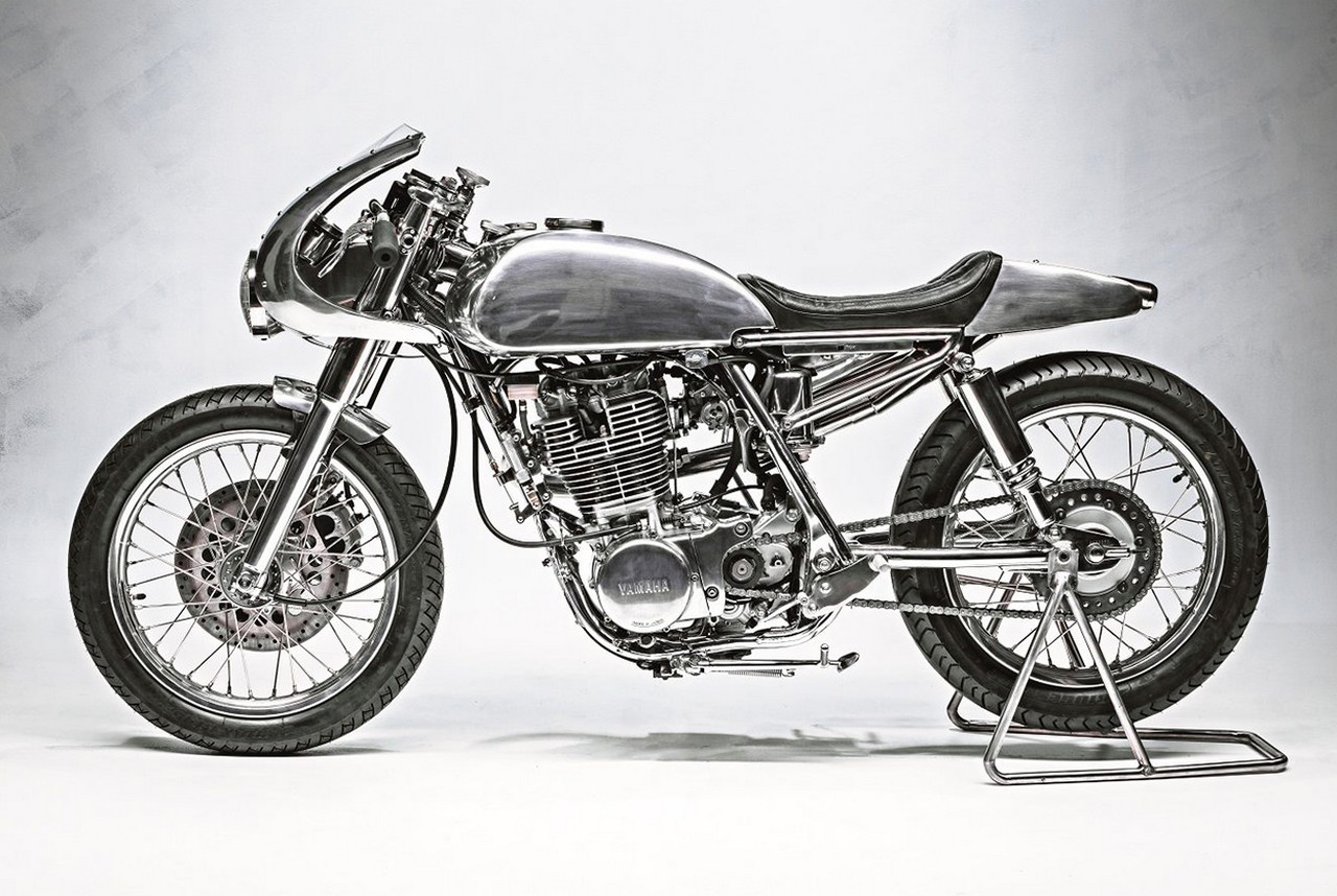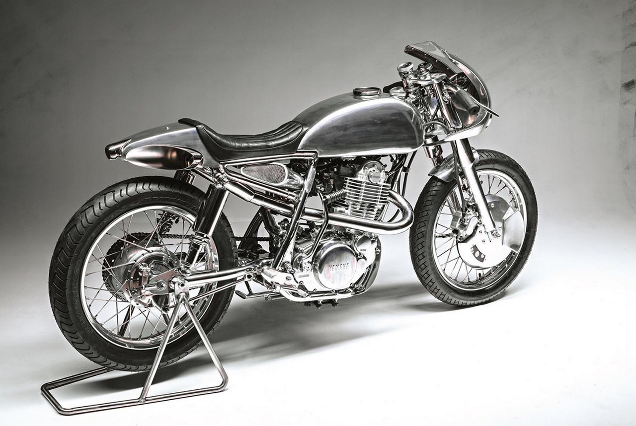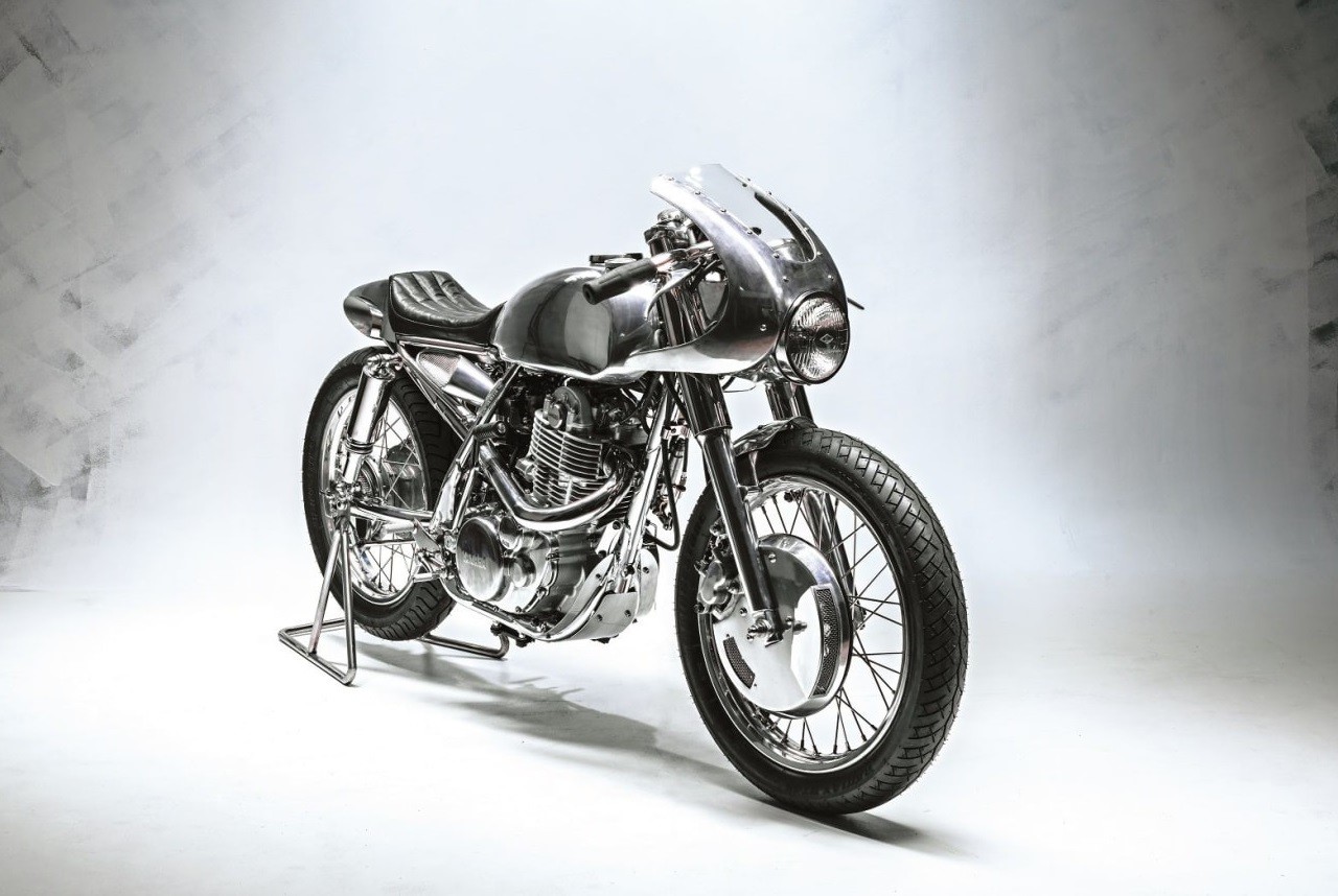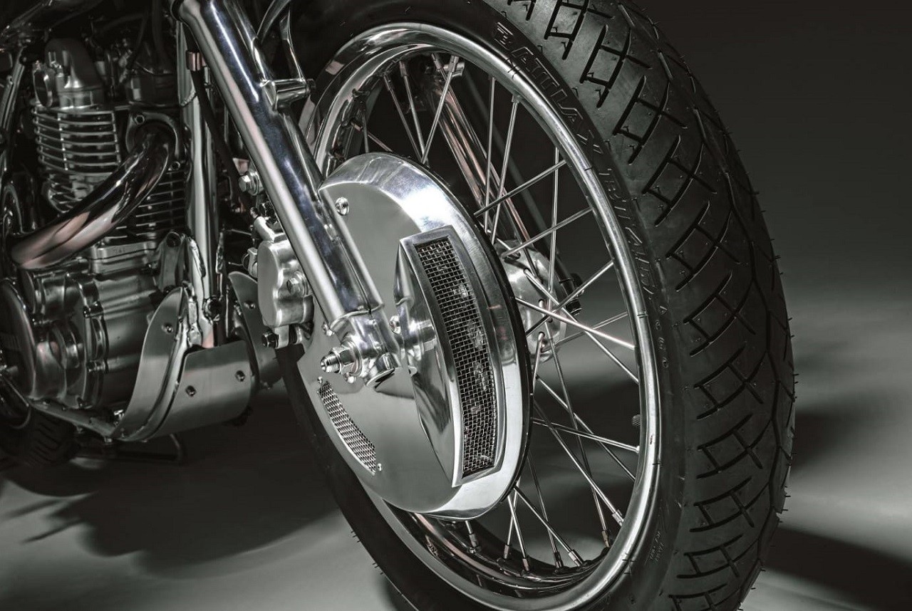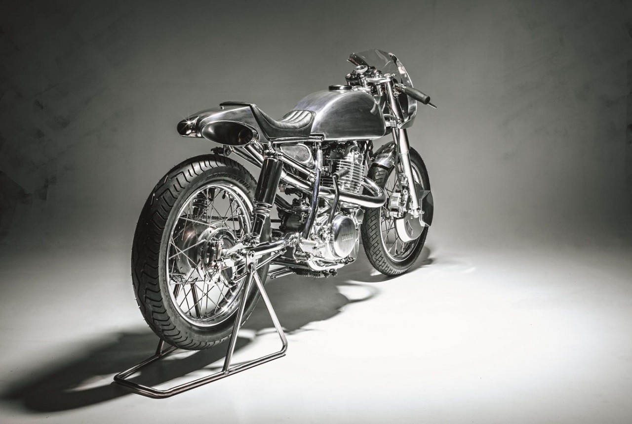 Built for a local Yamaha dealer, the bike is based on a 2016 SR400 model. Its transformation began with ditching the subframe and the addition of a stainless steel tail and leather seat fitted on a new perch. A custom exhaust has been fabricated and runs through the tail unit, while various parts hand-made from aluminum–including a front fairing, tank, and disc brake with art deco-inspired vented cover–complete the unique bike.