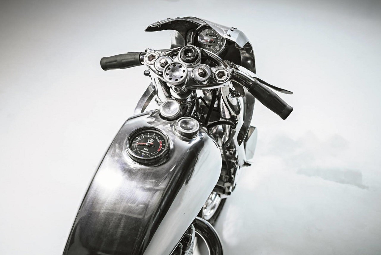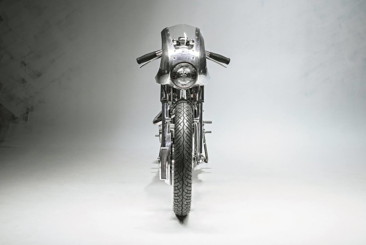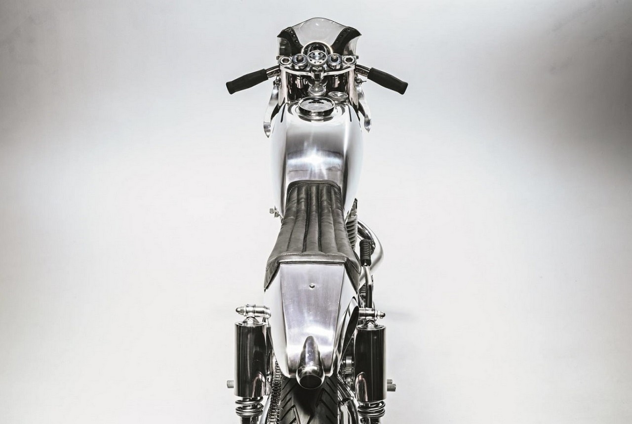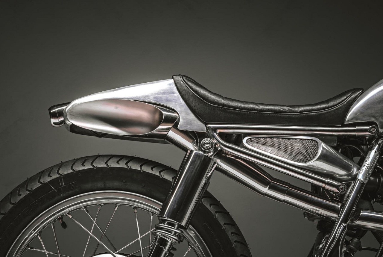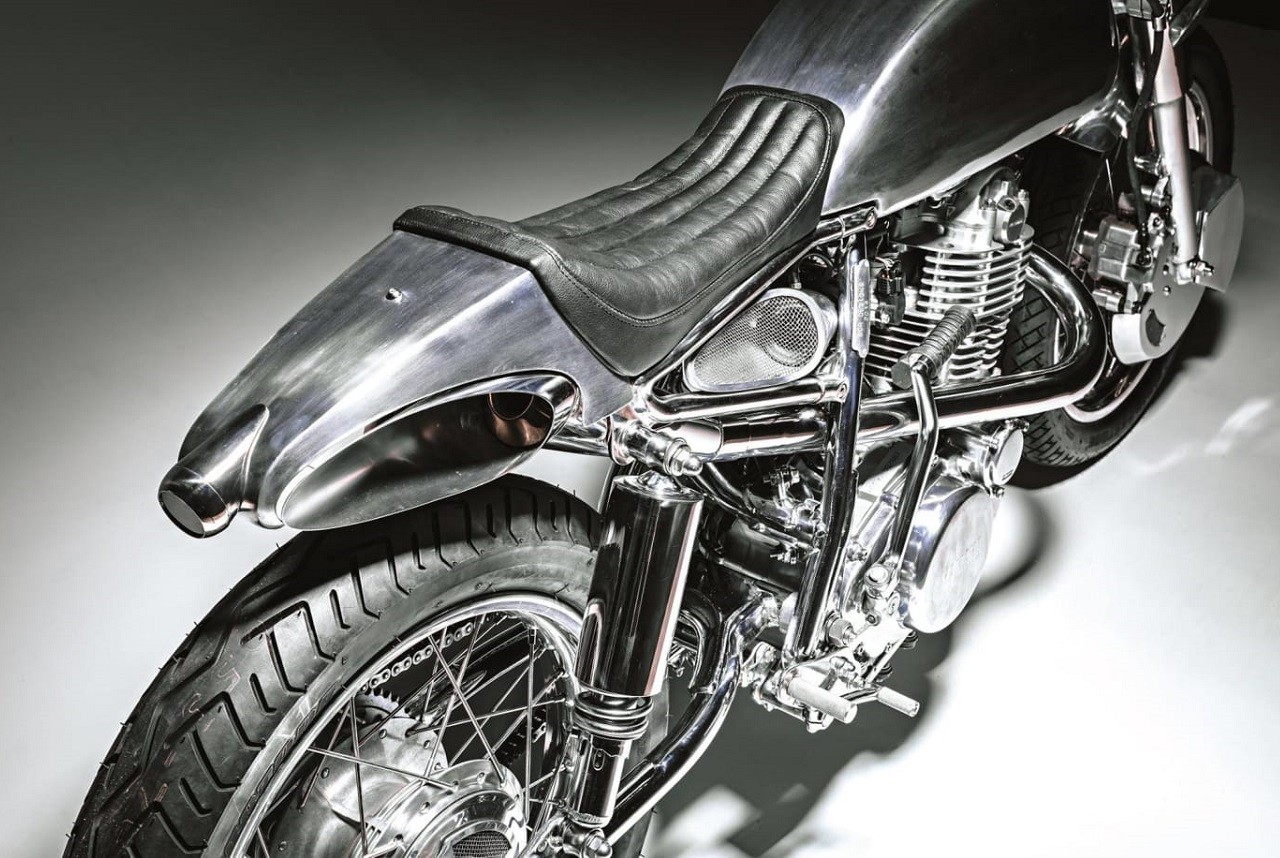 Built for a local Yamaha dealer, the bike is based on a 2016 SR400 model. Its transformation began with ditching the subframe and the addition of a stainless steel tail and leather seat fitted on a new perch. A custom exhaust has been fabricated and runs through the tail unit, while various parts hand-made from aluminum–including a front fairing, tank, and disc brake with art deco-inspired vented cover–complete the unique bike.