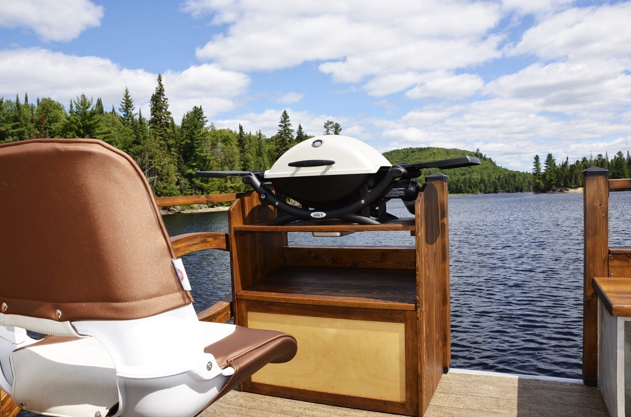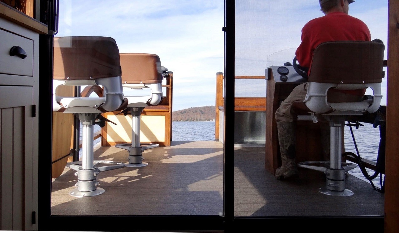 The deck area features three swivel seats, sonar system, dashboard with instrument panel, and even a fish tank that lets you store the day’s catch before you throw it on the barbeque.