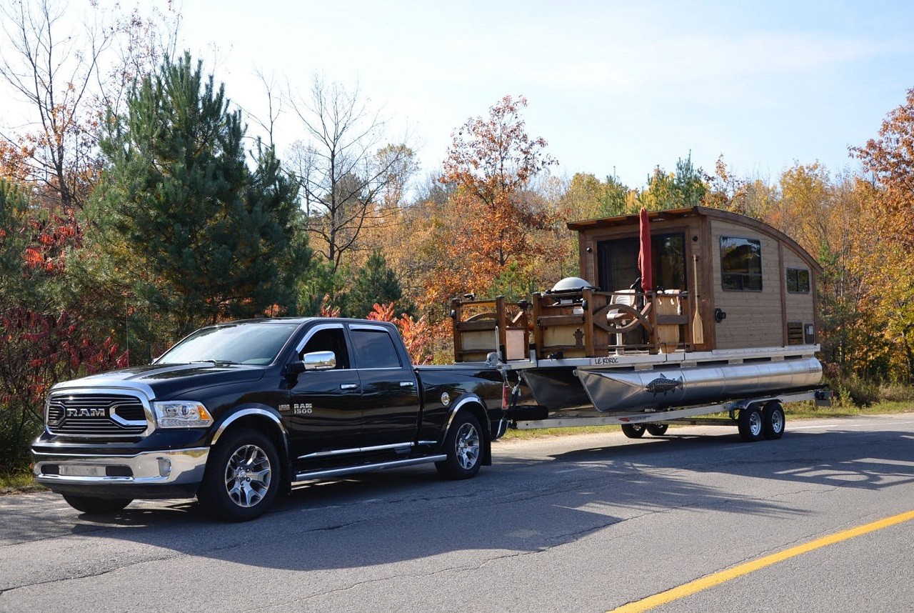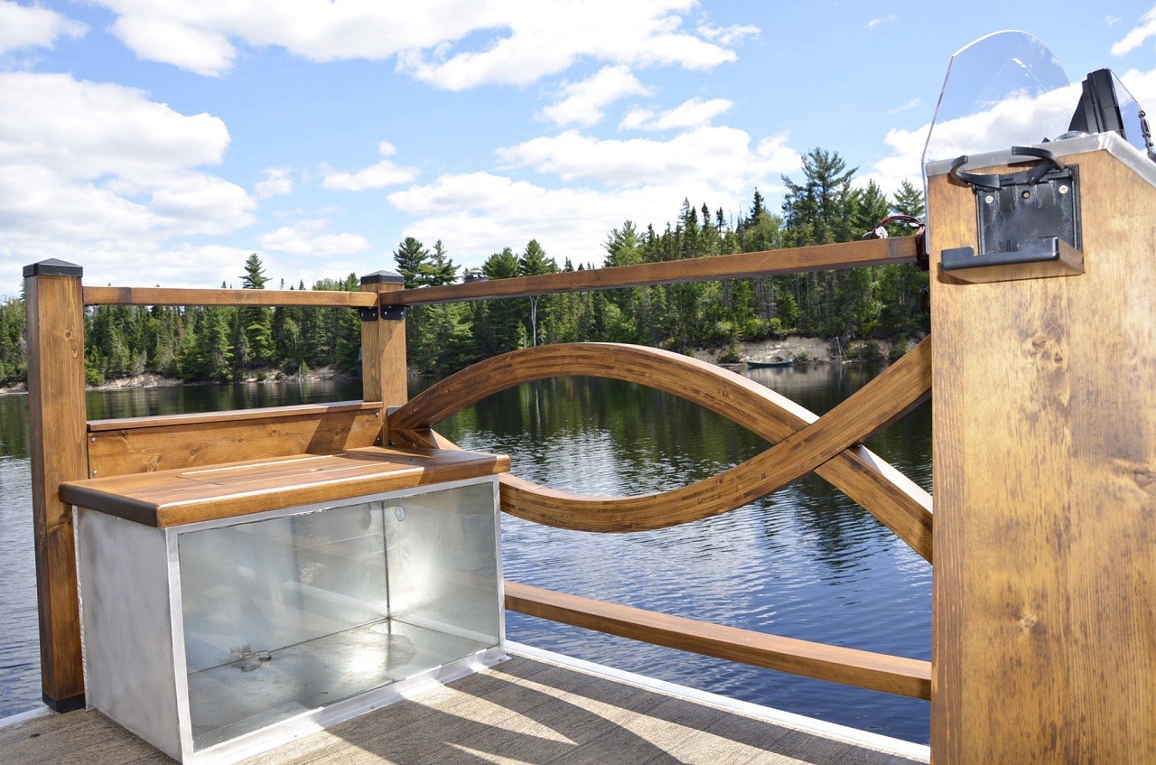Mostly constructed from sustainably-sourced cedar and plywood, the 5,640 lb houseboat floats atop three aluminum pontoons. It’s powered by a 90-hp Honda BF90 VTEC outboard, while roof-mounted solar panels connected to batteries provide electricity.