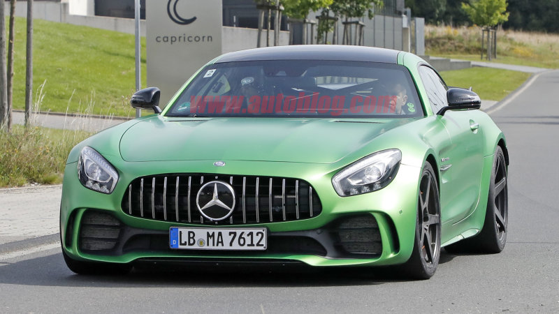 AMG is seemingly prepping a harder-core version of its hardest-core car, the 2018 Mercedes-AMG GT R. Spotted at the Nürburgring in the GT R’s exclusive Magno Green Hell paint, what will possibly become the AMG GT R Black Series can clearly be differentiated from its relatively lesser sibling.