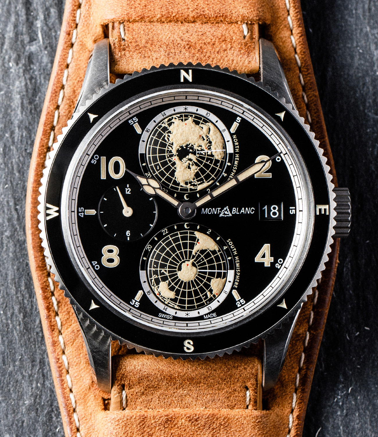 Let’s take a look at that dial first. The numerals are coated in a thick smattering of warm, beige hue that gives the dial both a vintage feel and a degree of dimensionality — they ever-so-subtly pop from the dial’s surface. Similarly, the globes representing the northern and southern hemisphere are domed, another smart choice by the designers that adds depth to the dial. The continents upon those globes are wonderfully textured, something you can’t notice until you’re looking closely — the application of lume is almost topographical. Oh yes, those continents are all coated in Super-Luminova, giving the Montblanc one of the coolest nighttime dials I’ve ever seen on a watch.