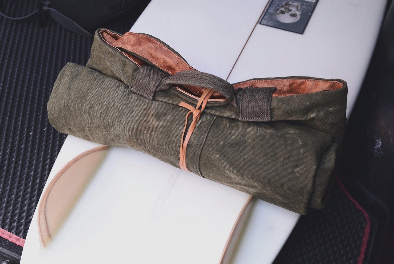 The tough bag uses repurposed 22oz tent canvas made of American cotton and is reinforced with vegetal-tanned leather. Easily adjustable via leather belts, the lightweight bag can accommodate boards of up to 7 ft long. When not in use, it rolls up into a compact, travel-friendly size.