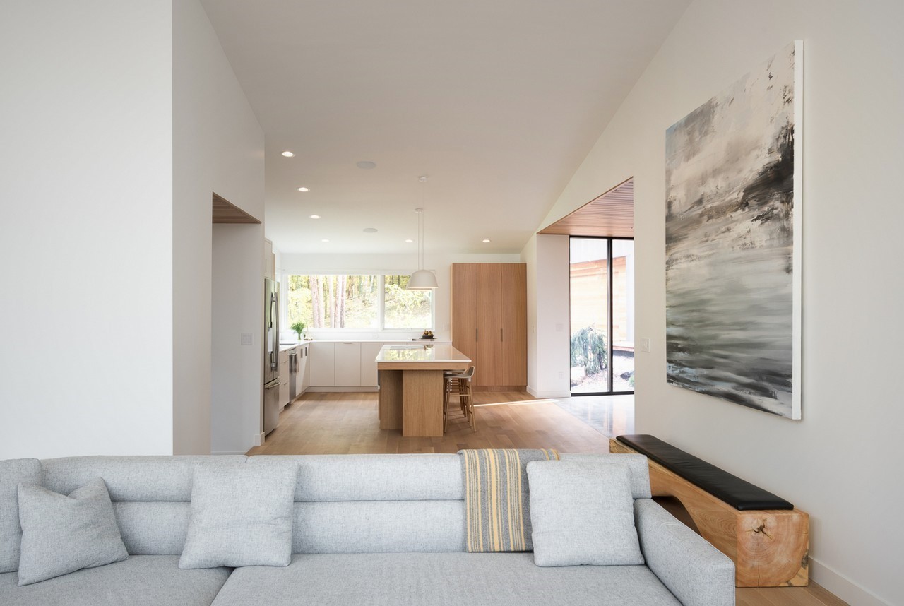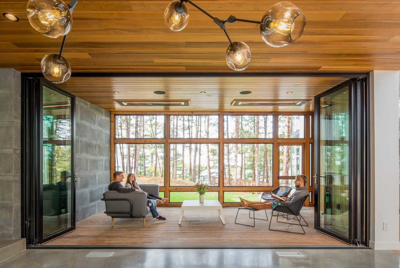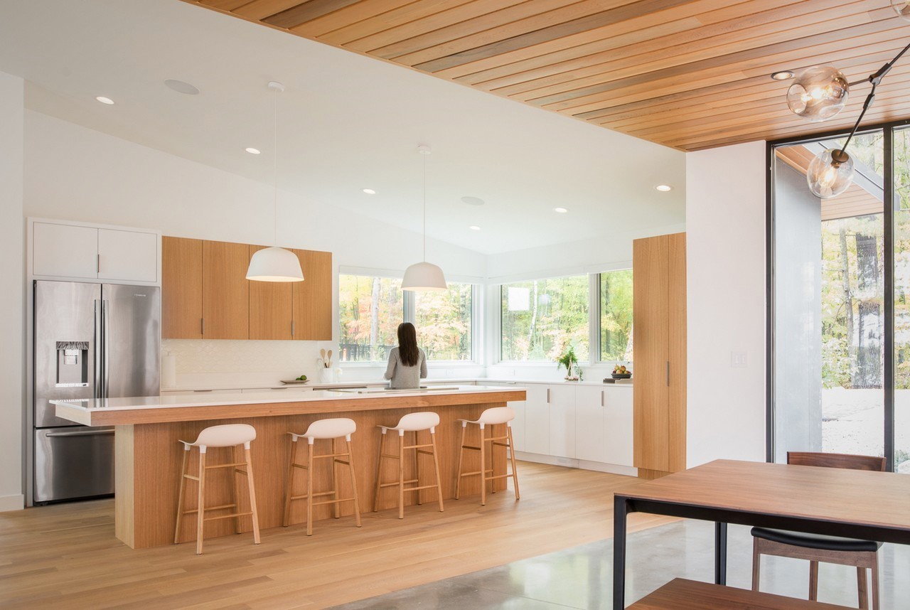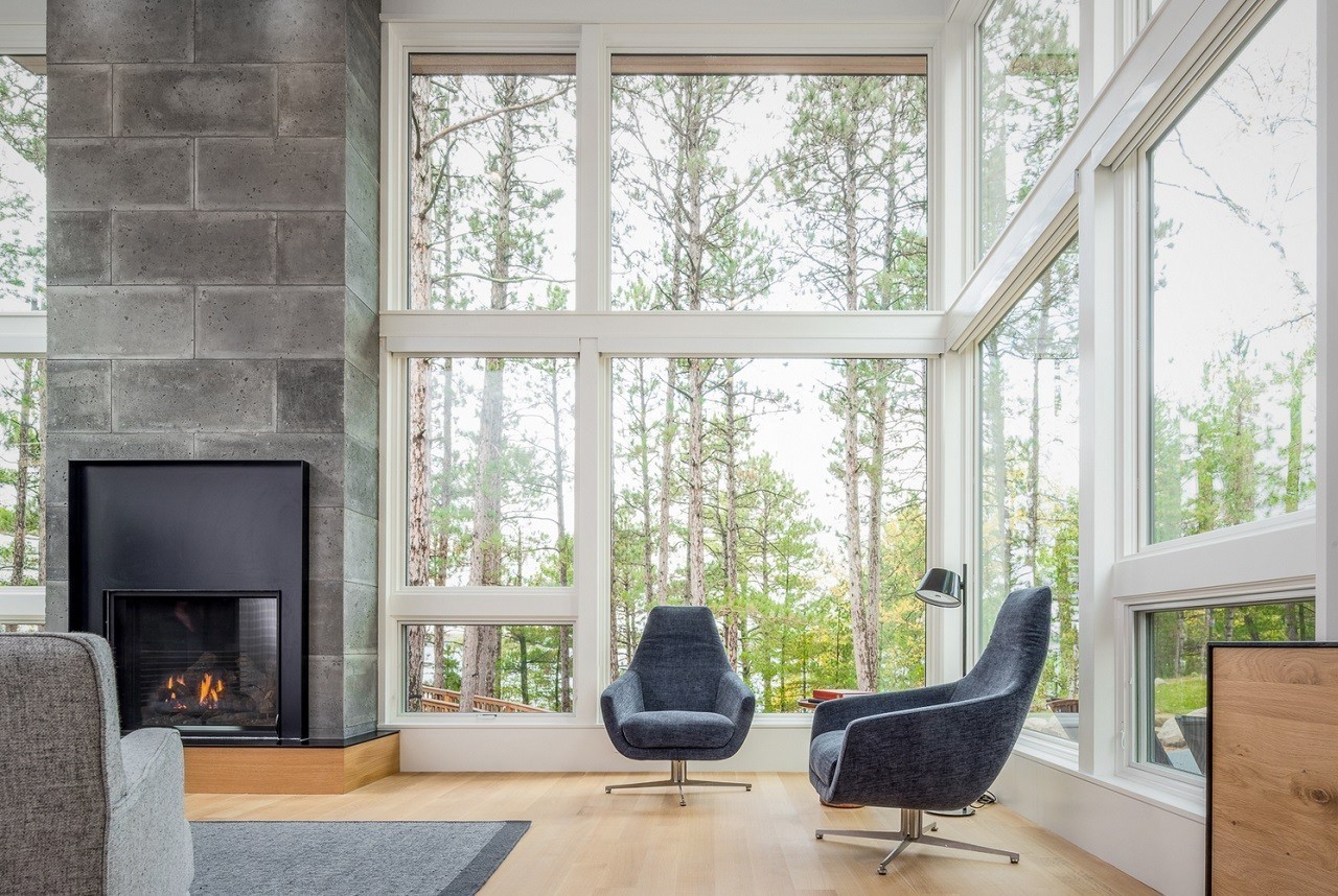 Clad in white oak, the spacious living areas feature extensive glass windows throughout, offering arresting views of the unspoiled woods and lake beyond.