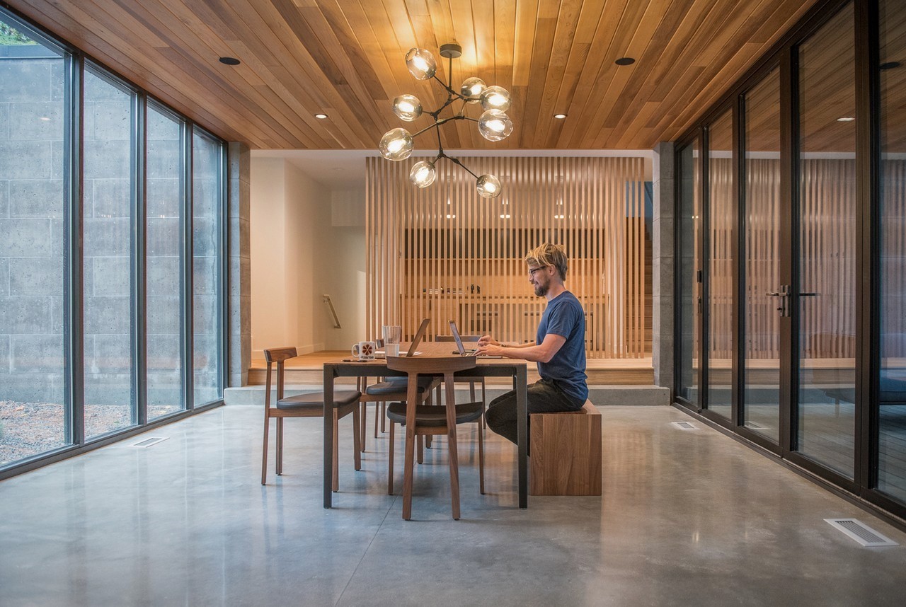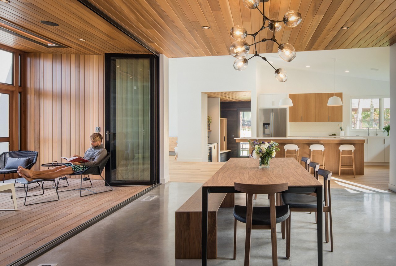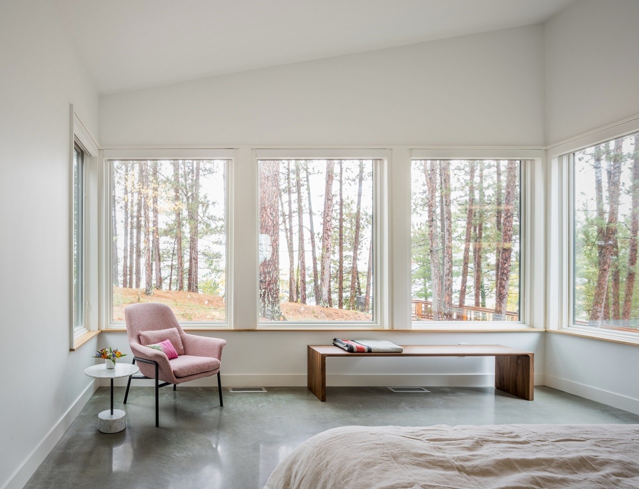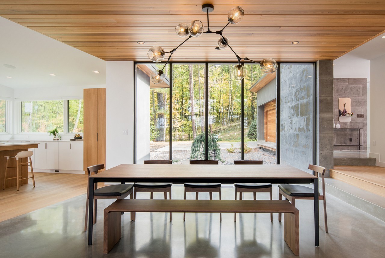 Clad in white oak, the spacious living areas feature extensive glass windows throughout, offering arresting views of the unspoiled woods and lake beyond.