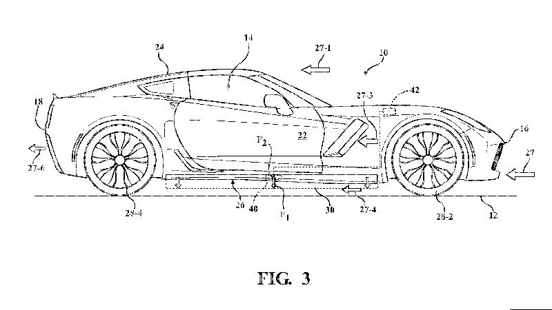 The latest patent app goes into the features such a system might control. The active side skirts would be able to extend toward the road in order to contain airflow under the car and streamline airflow around the rear wheels. The active spoiler could raise and lower the entire structure by moving stanchions within rails set into the fenders, as well as pivot just the wing portion. And get this, one image in the patent app shows a movable spoiler on the roof. The downforce-generating ducts, potentially placed on the roof and the lower portion of the vehicle, would hasten airflow past the car, and could otherwise be used to produce a venturi effect. Should the mid-engined Corvette wear such appurtenances, America’s sports car would get more ammo to join a tech conversation dominated by European marques.