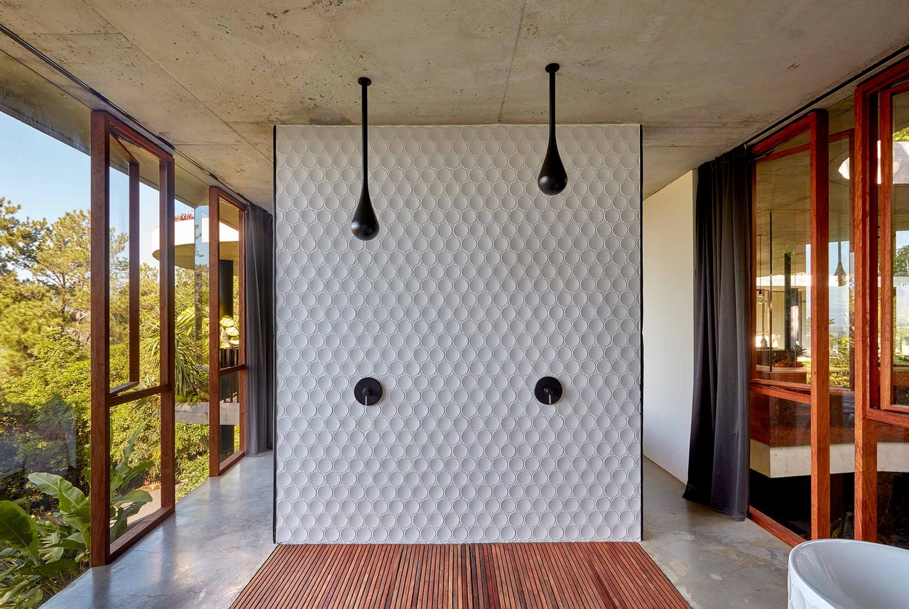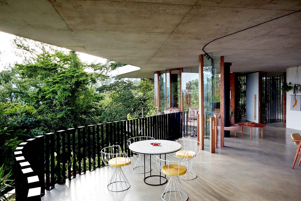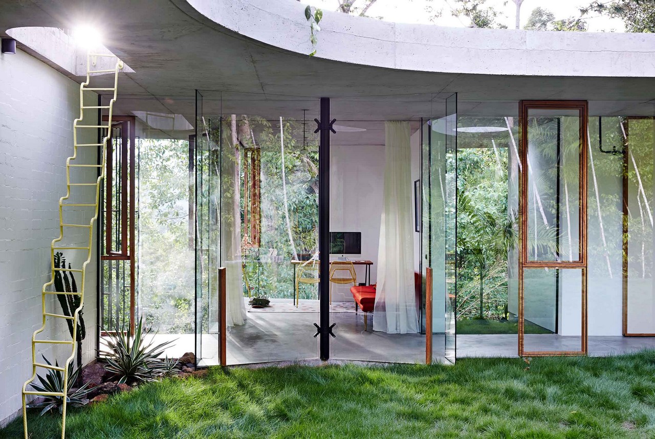 Wedged between two curved concrete slabs, the dwelling features floor-to-ceiling windows throughout letting natural light protrude and connecting the inhabitants to the lush exterior. The internal walls are also concrete, minimally adorned to maintain an open feel. Contrasting warm materials can also be found inside, like the brick and timber that form the bookshelves-lined wall that opens to reveal the master bedroom.