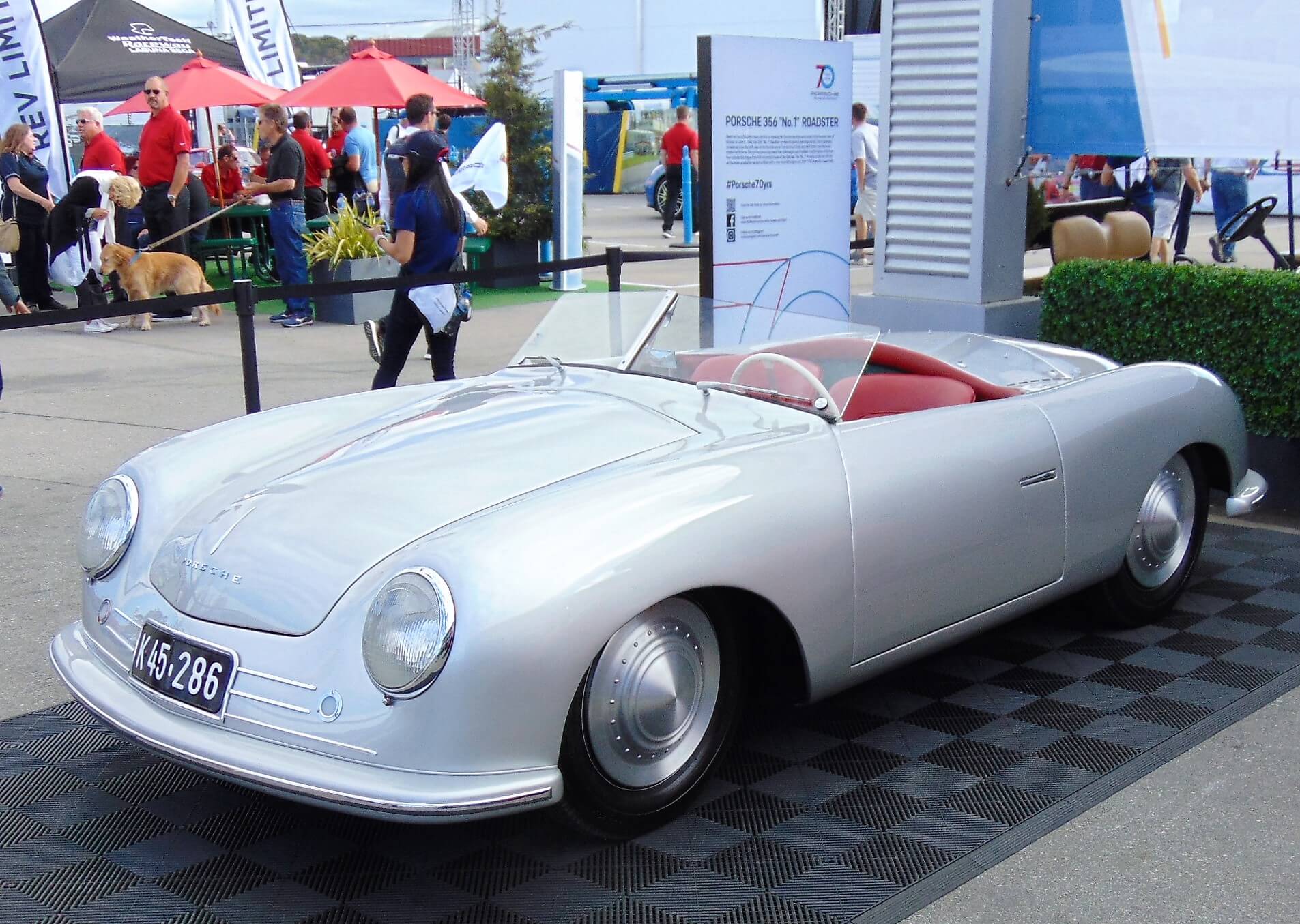 On Sunday morning, a replica of the car that began the celebrated Porsche legacy, Porsche’s 356 “No. 1” Roadster, was positioned in front of Champions Garage in a bright metallic silver paint.