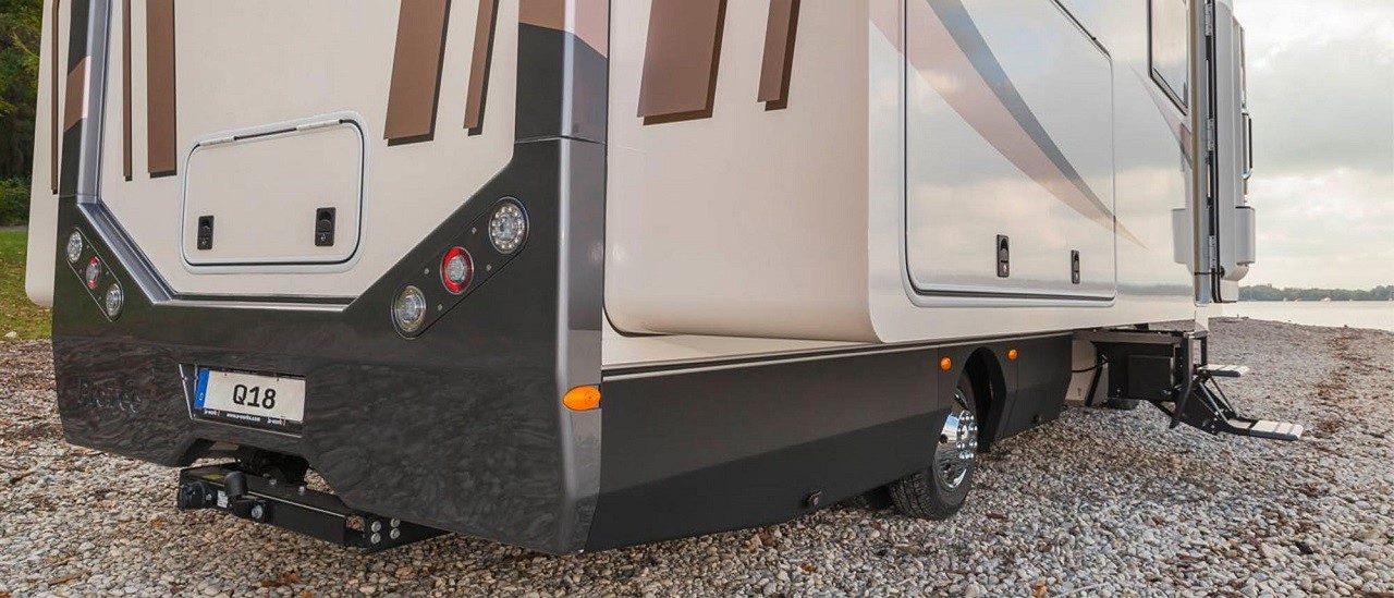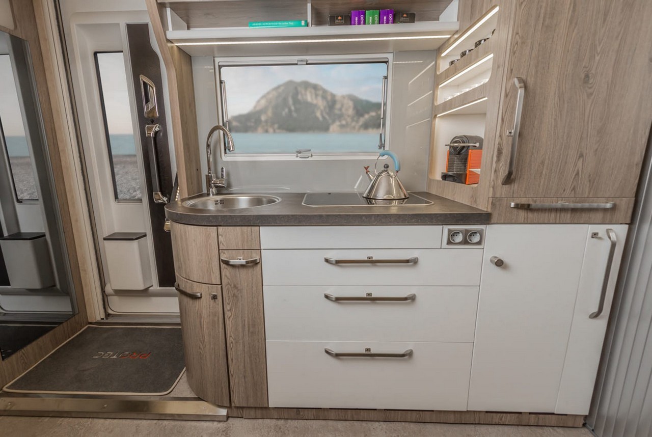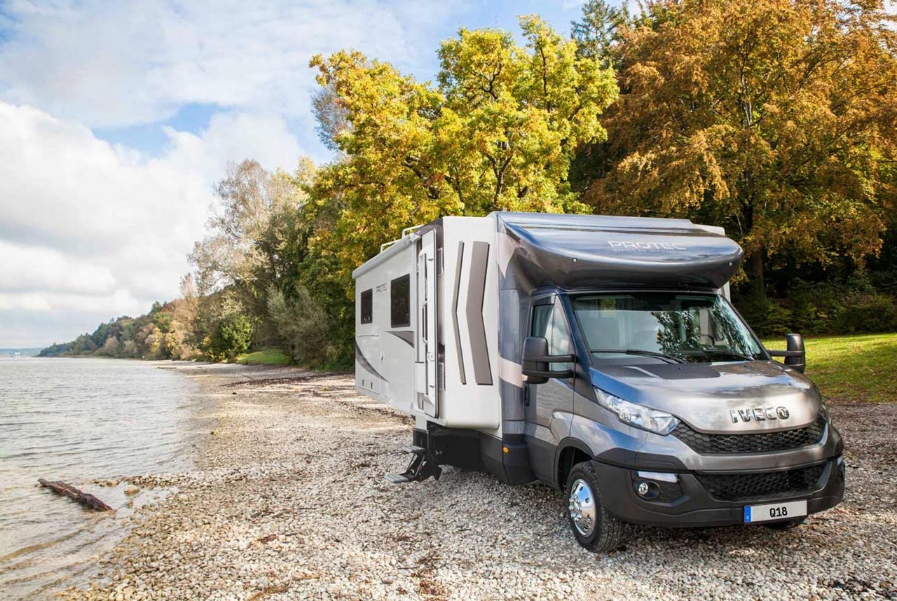 Protec’s Q18 Expanding Motorhome is the world’s first mobile home with slide-outs for the whole body length and on both sides. Going from a width of 7.5 ft to 11.5 ft at the push of a button, the innovative motorhome keeps its body compact on the road while opening up to offer a larger living space when camping.