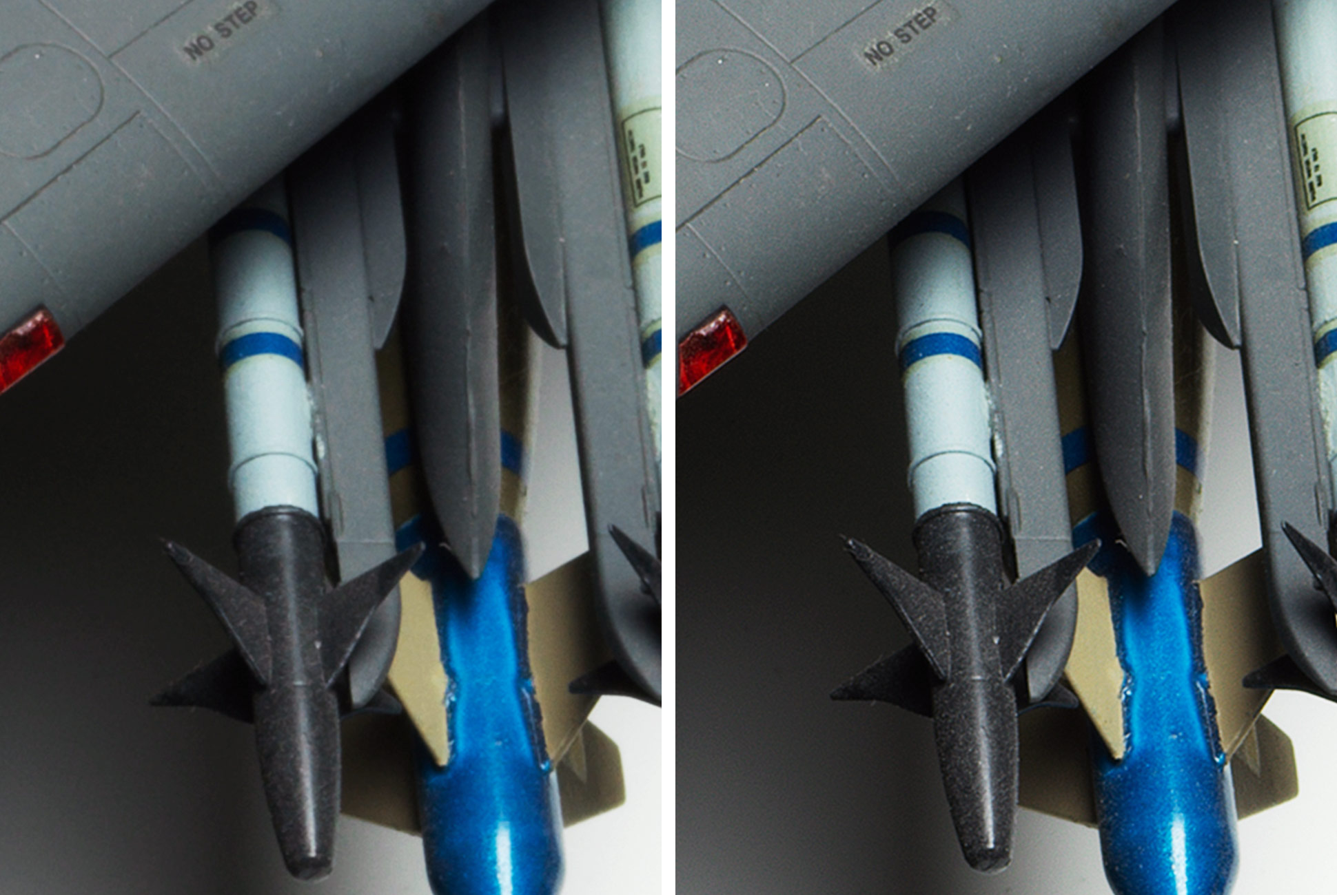 With dad’s model, you can see the camera’s power in the details. The yellowing of the decals, though unflattering, is still an important nuance, and it can be detected much better when photographed in color-enhancing six-shot mode. Details in vents, panels, and even inside the cockpit — visible through the not quite optical-grade plastic canopy — are crisp and complex. Even the imperfections in the paintwork, which are intrinsic to model building, come across not as flaws but as character elements, which fade at a distance, giving the model the realism people crave. In these images, it doesn’t look like a “real” F-15 up close. It looks like something an actual human built.