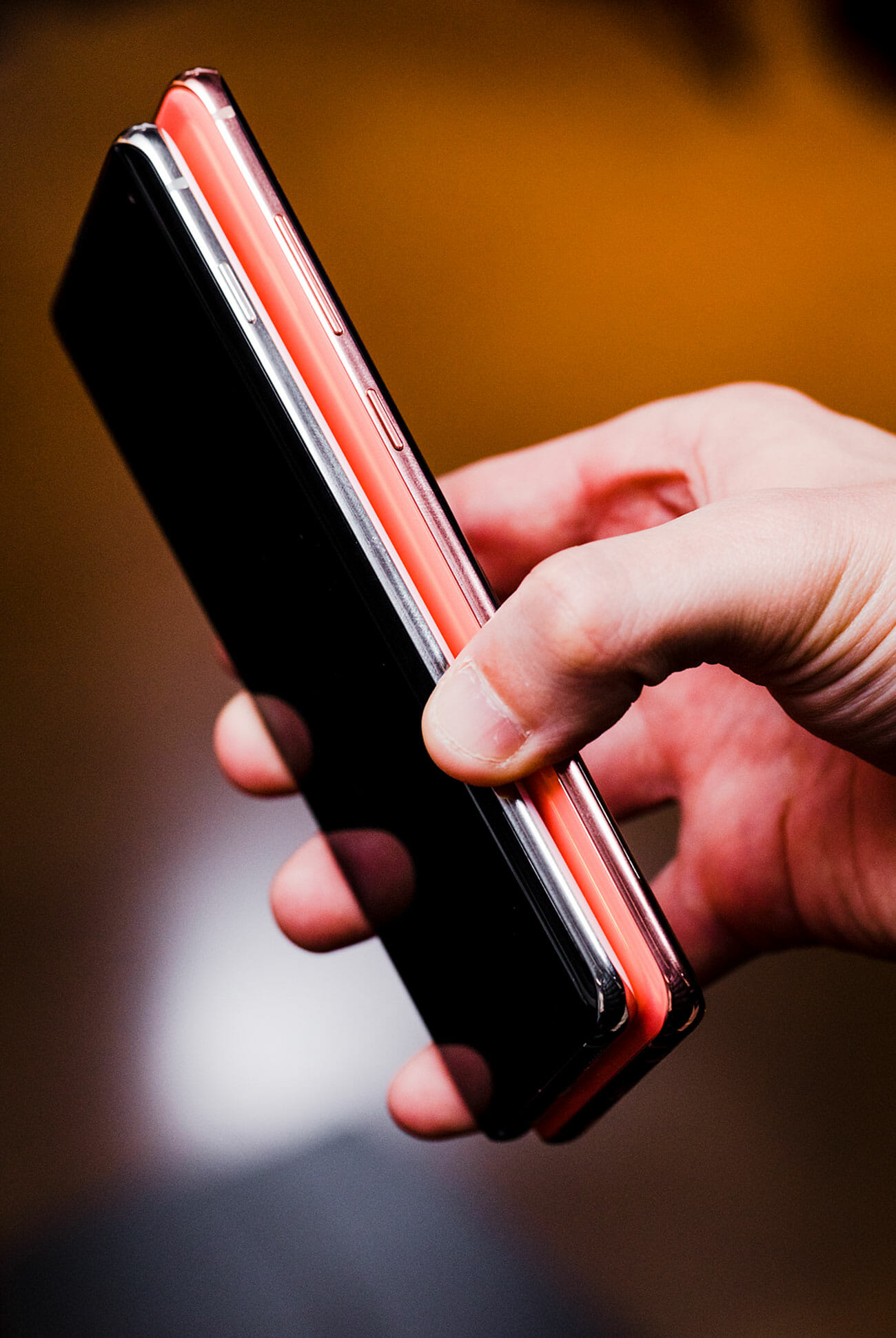 Hands-on reaction: In the few minutes I had holding the phones, the new front-facing camera felt smooth, very smooth. There’s no notch or camera bump. And the screen above the cameras was still usable, although it was a little weird swiping down over the camera. There might be an issue of dirtying up the camera.