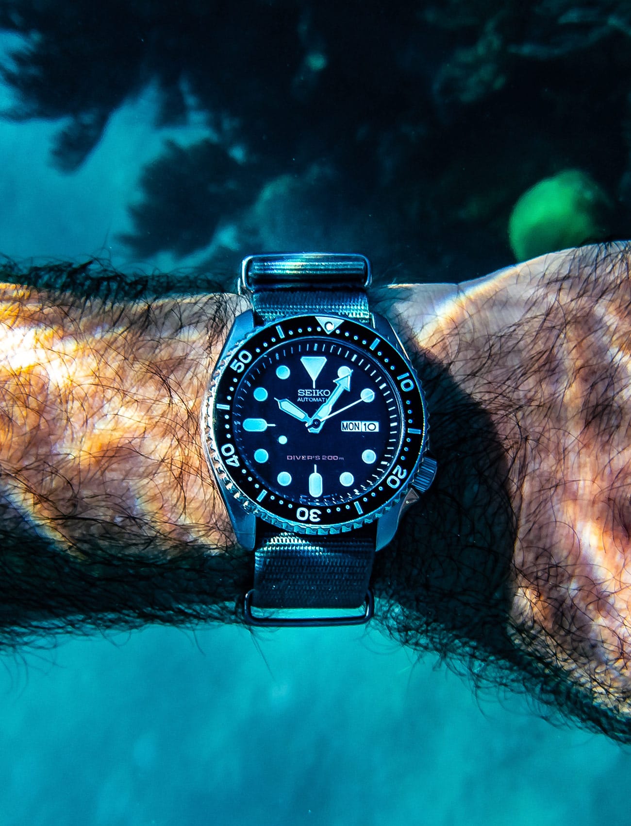 Having others dive with the SKX007 wasn’t my initial plan, of course, but it gave me an opportunity to photograph and observe the watch from an interesting perspective. Diving more or less side-by-side with Isabelle as we made our way through The Cathedral, I saw the SKX007 gleaming in the filtered blue light of coral canyons, and I saw its Lumibright markers and hands maintain bold legibility as we descended into dark tunnels. Of all the watches I’ve taken diving, the SKX007 handily won the legibility contest, and all the fussing over aesthetic minutiae that I so readily engage in on land gave way to a blunt appreciation for the fact that Seiko designed the SKX007 for one purpose: SCUBA diving.