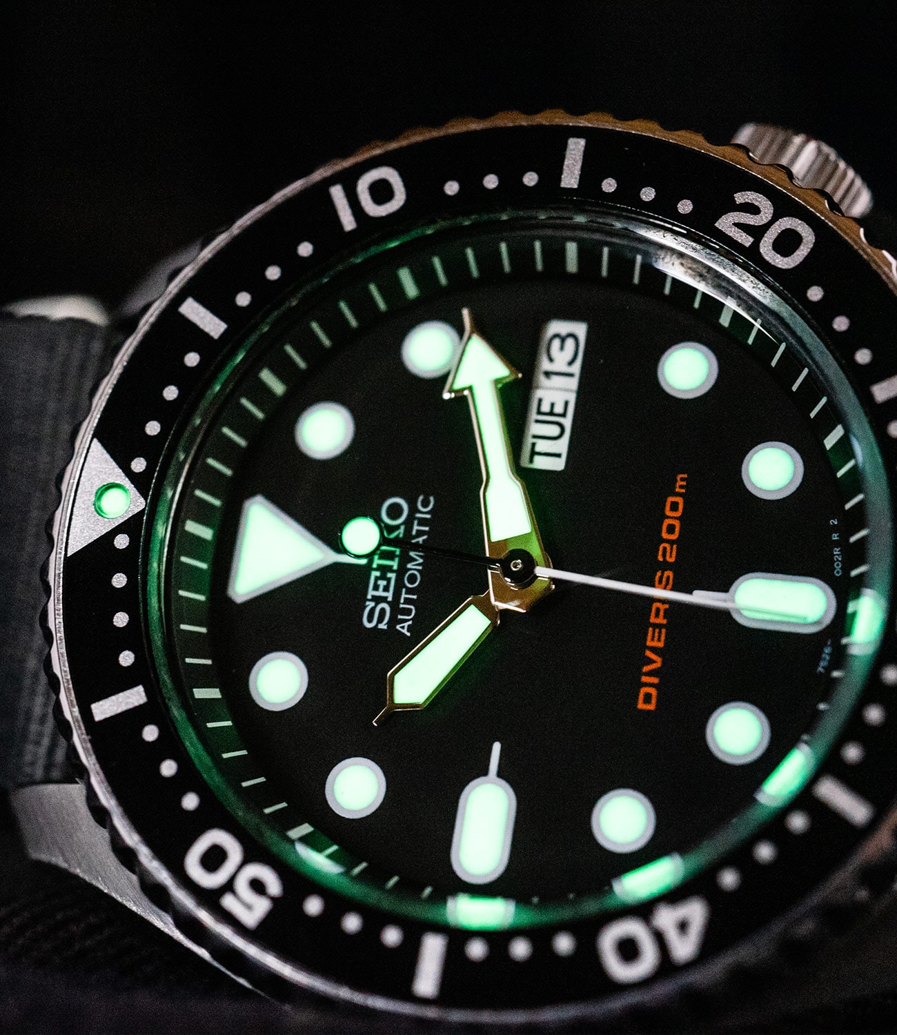 Most would agree that when you buy an SKX007, you’re paying for the watch head, not the strap or bracelet. The rubber strap that ships on most SKX007s lacks suppleness, is a little chalky, and has visible — perhaps even irritating — seams. The bracelet that Seiko ships with some SKX007s lacks the elegance and close tolerances of superior Jubilee-style bracelets. However, given the $200 price tag, no one really complains, and pretty much any third-party strap looks great on this watch. I typically sport my SKX007 on nylon NATOs in all sorts of colors — everything matches.