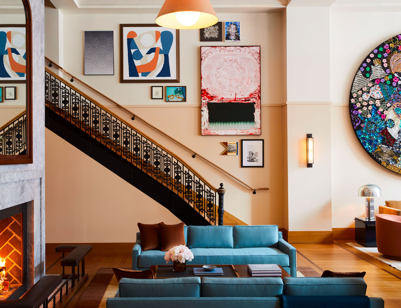 The lobbies and communal spaces are decorated with muted furniture, bright artwork and various Detroit history Easter eggs.