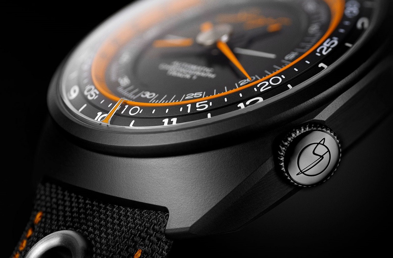 What makes the Hong Kong Edition stand out from the previous two versions are the sporty orange accents on the dial and the black ceramic-coated aluminum case that keeps the weight light while providing a tough, scratch resistant layer, and of course, good looks.