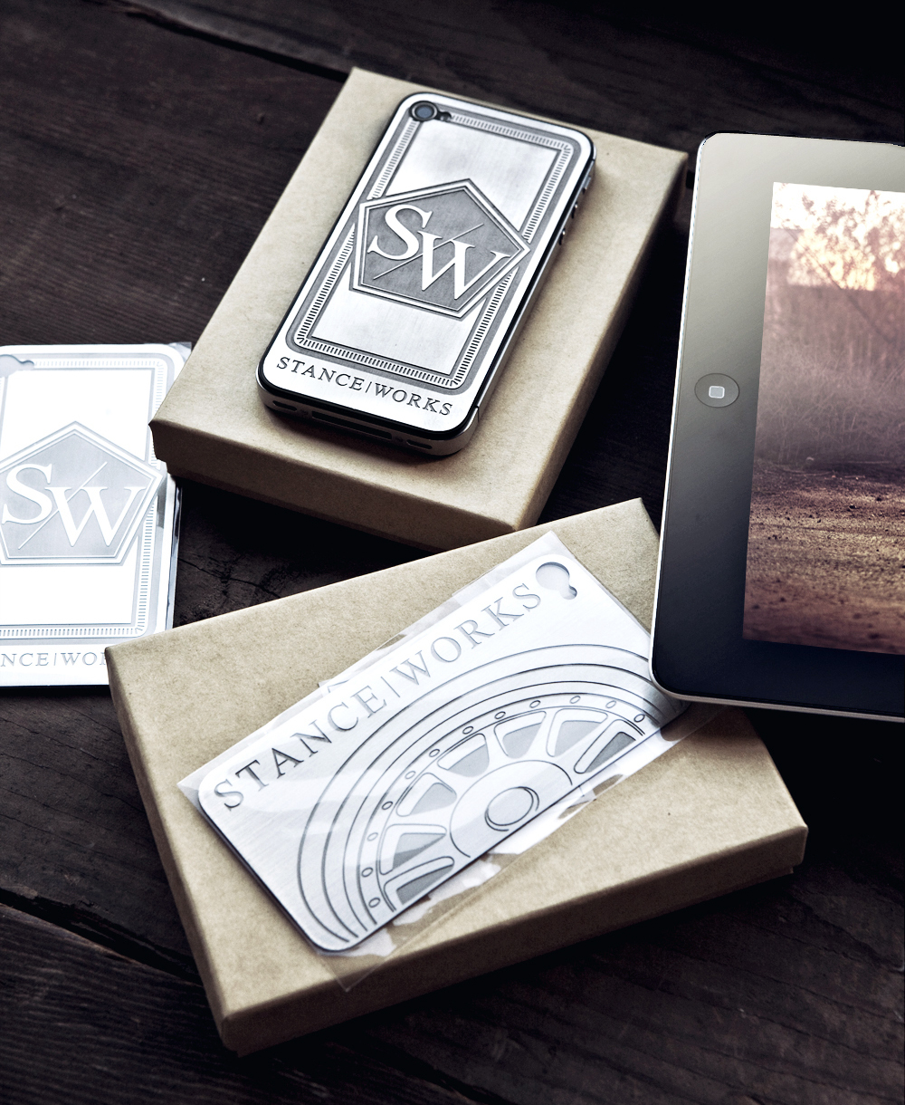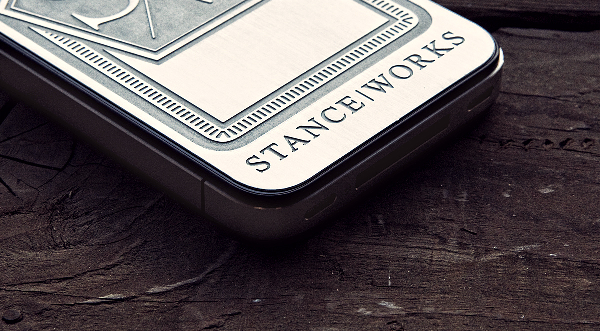 STANCE|WORKS and The Lowly Gentlemen offer a new spin on stainless steel iPhone covers with skillfully etched backing plates. The cases come in two designs adorned with the STANCE|WORKS logos. The backing plates are chemically etched in the USA, and protect the glass backing on your iPhone 4 and 4S.