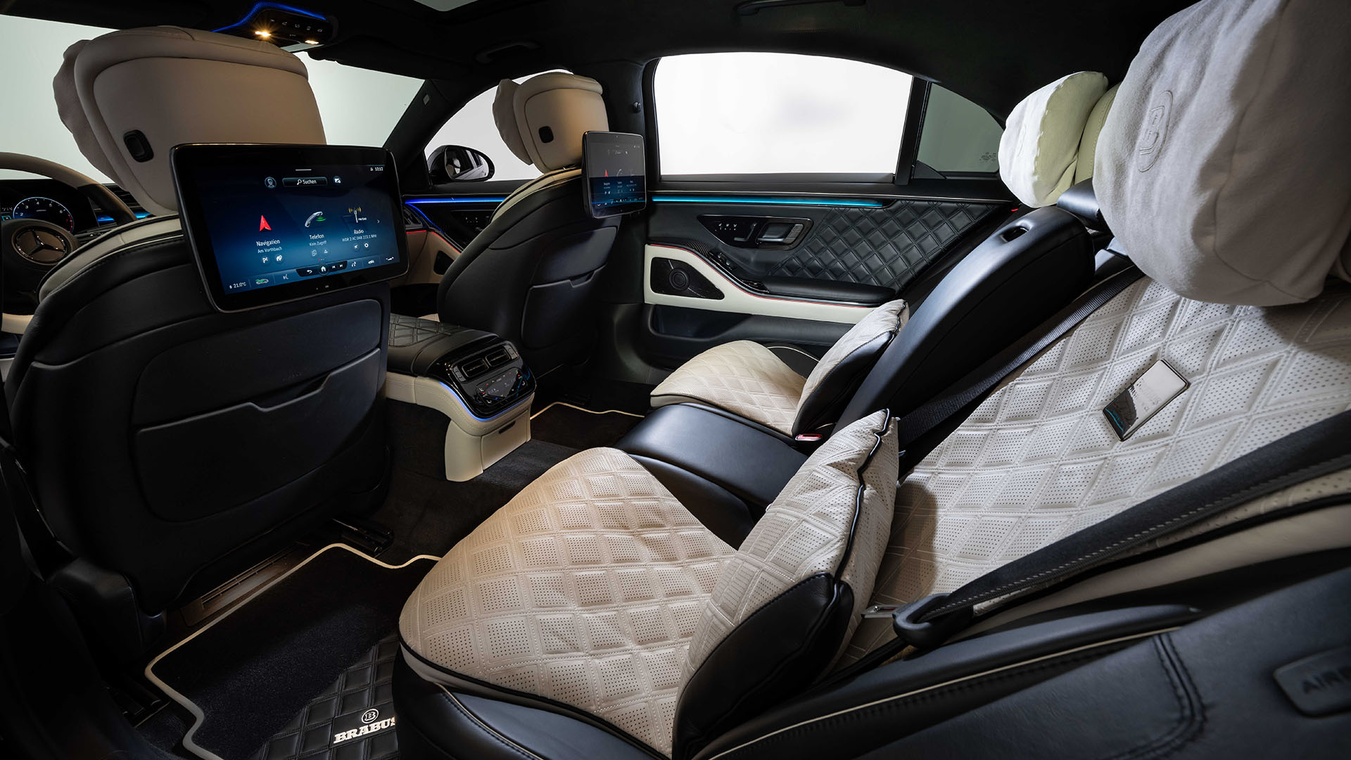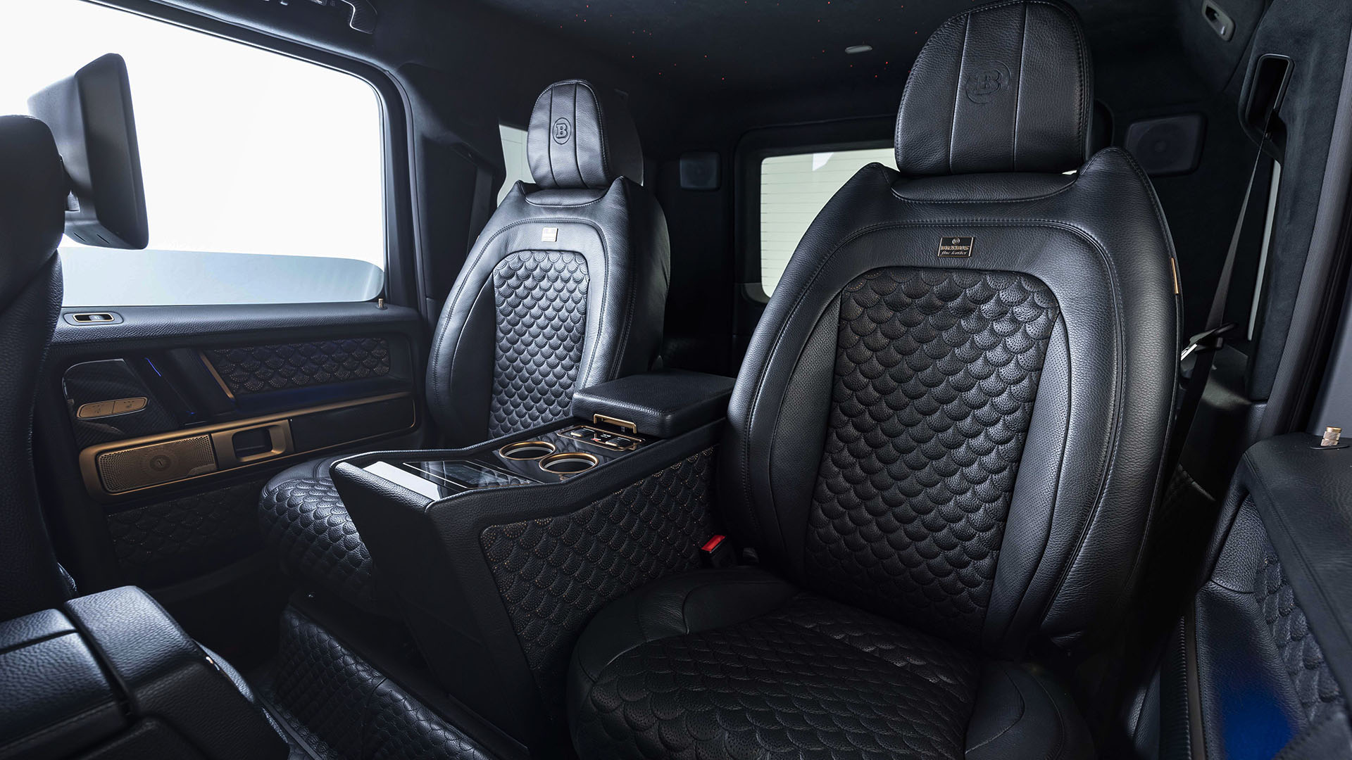 On their 900 ROCKET EDITION, BRABUS replaces the rear bench seat with two individual seats and a central console in between them that holds a fold-out table, so you can work in a laptop or tablet while being seated in the rear, both seats are not only heated, but also cooled, and even the cup holders are cooled and heated.