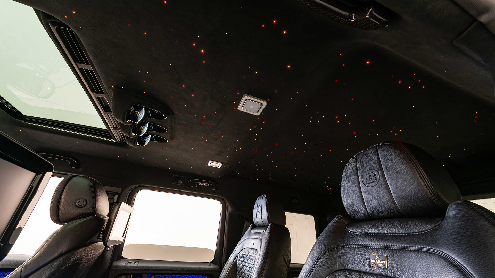 There is even a 4.3″ touchscreen installed at the rear that controls the rear seat adjustments and grants access to the factory original ‘COMAND’ system of the G-Wagon … you can control the sound system with it, turn on the reading lights in the rear. And if that’s too much bother, there is the option of connecting a smartphone via the USB cable and control the COMAND that way, while your phone or tablet gets charged at the same time. BRABUS added a few displays in the headliner so passengers can check the outside temperature, see how fast the driver is going, and find out what time it is, all while the ‘fridge’ in the central console keeps your drinks cooled.