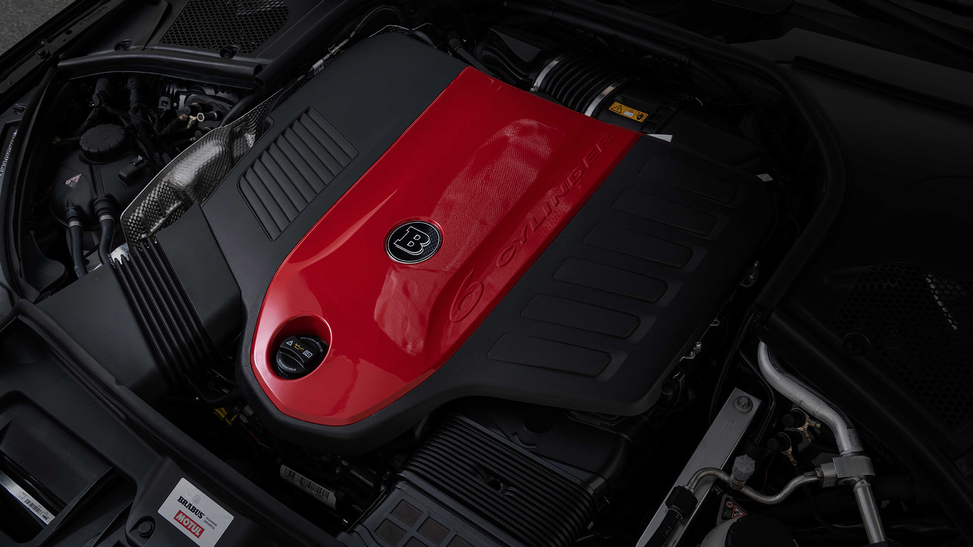 But first, back to what makes the BRABUS 900 ROCKET EDITION tick, the highly modified engine, if you know the statistics, the base G63 comes with a 3,982 cm³ displacement V8 engine, BRABUS takes that engine apart and bores out the cylinders to 84 mm and mills a new crankshaft from a solid rod of aluminum … the result is a displacement of 4,407 cm³, but that alone isn’t enough to get a power increase of 315 PS, so BRABUS replaced the factory original turbochargers with a pair of their own, in-house units that are capable of a 1.4 bar boost, a ram-air intake made from carbon fiber makes sure these turbos can draw enough cold air, and just for looks, the engine is covered with a stunningly beautiful, red infused carbon fiber cover.