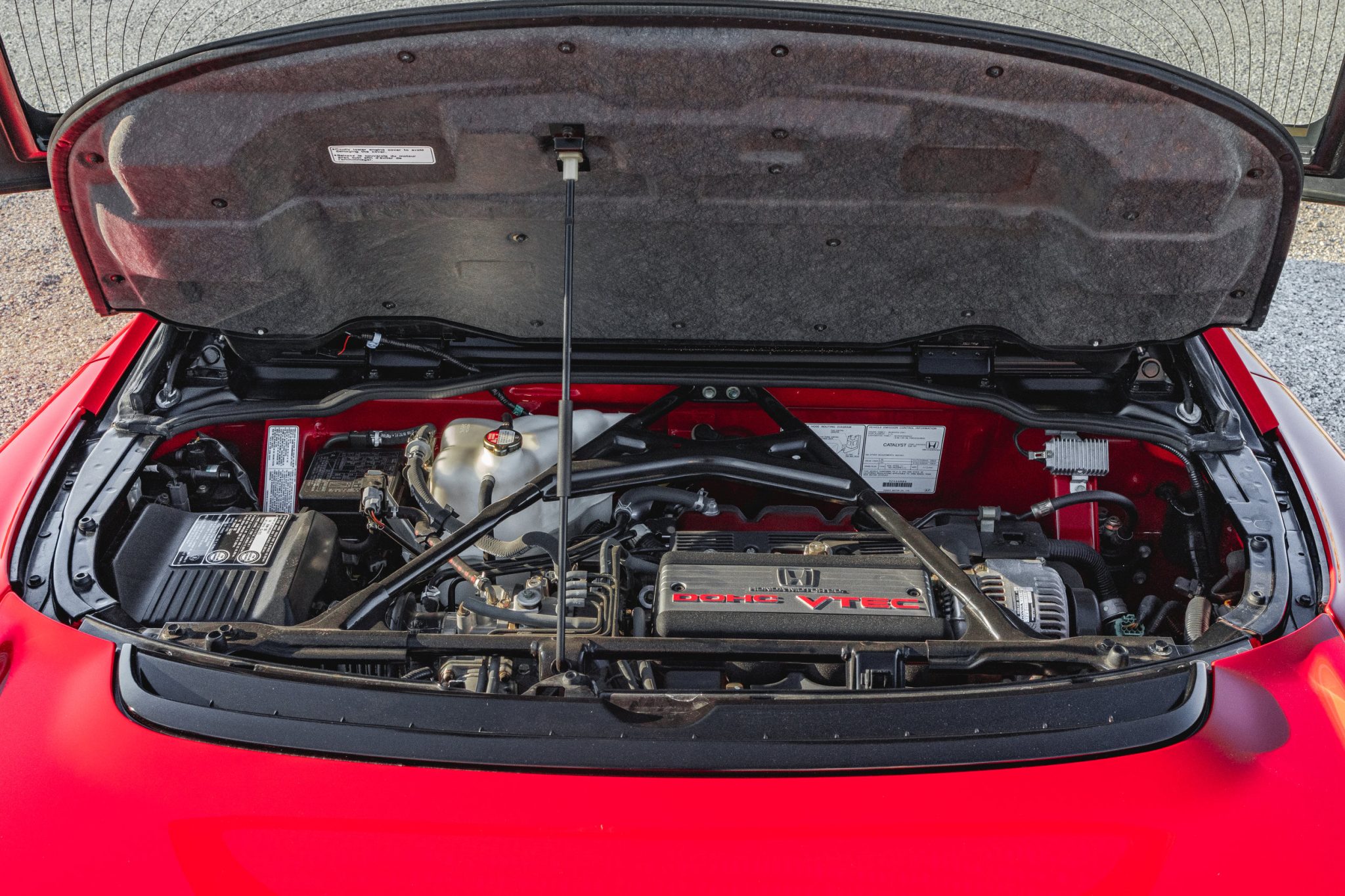 This NSX is only one of the 55 examples that were given a Formula Red (R-77) finish for the 1998 model year with a matching removable roof panel. The example has pop-up headlights and an integrated rear wing. It was also given 16- and 17-inch wheels with Kumho Ecsta XS tires, with the front tires measuring 215/45 while the rear measures 245/40. There is some curb rash on the wheels, with the tires have a mix of 2015 and 2013 date codes.